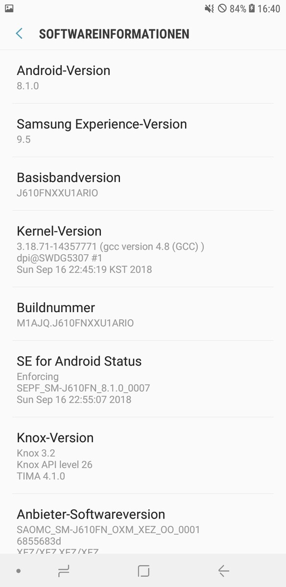 Samsung setzt beim Betrieb des Galaxy J6 Plus auf Android Oreo in der Version 8.1 mit Sicherheitspatches auf dem Stand vom 1. September 2018. Als Benutzeroberfläche kommt die hauseigene Samsung Experience 9.5 zum Einsatz, in der sich Samsung-Kenner schnell zurechtfinden werden. Aber auch für Neueinsteiger bietet das System eine übersichtliche Anordnung der Apps sowie eine strukturierte Menüführung. Obwohl Samsung ein Major-Update für die Smartphones der J-Serie vorsieht, ist aufgrund der mäßigen Systemleistung nicht davon auszugehen, dass Android Pie in Zukunft für das Galaxy J6+ zur Verfügung stehen wird.