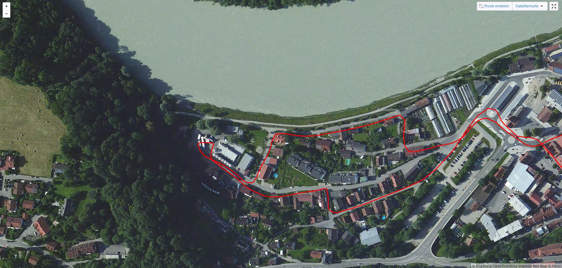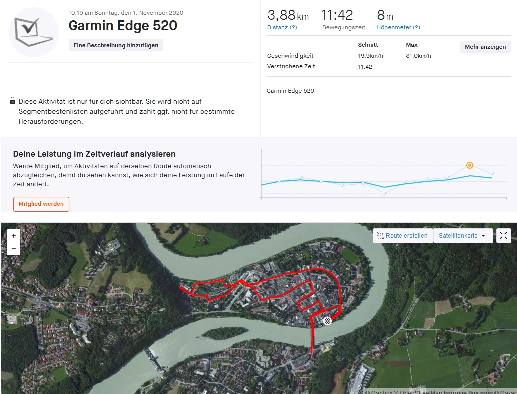 Für unseren Praxistest zur Ortungsgenauigkeit steigen wir aufs Fahrrad und nehmen neben dem Galaxy M31s auch das Navigationsgerät Garmin Edge 520 als Vergleichsgröße mit. Das Smartphone zeigt sich dabei eher mittelmäßig genau, es kann zwar den Fahrtweg insgesamt gut nachvollziehen, liegt aber oft ein paar Meter neben der Strecke, beispielsweise auch bei der Brückenquerung, wo wir laut Galaxy M31s über den Fluss schweben, während wir im echten Leben natürlich die Brücke verwendet haben. Damit zeigt sich das Smartphone ungenauer als sein Schwestermodell und wir können es zur Navigation nur empfehlen, wenn keine allzu genauen Daten benötigt werden.