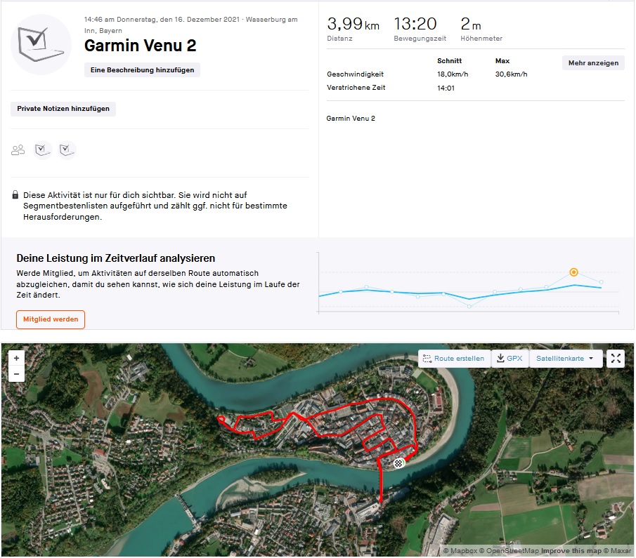 Um die Ortungsgenauigkeit unseres Testgerätes in der Praxis einschätzen zu können, zeichnen wir parallel eine Strecke zu Vergleichszwecken mit der Garmin Venu 2 auf. Die Positionsbestimmung erfolgt mittels der Satellitensysteme GPS (L1), GLONASS, BeiDou und Galileo (E1) sowie der SBAS-Unterstützung.