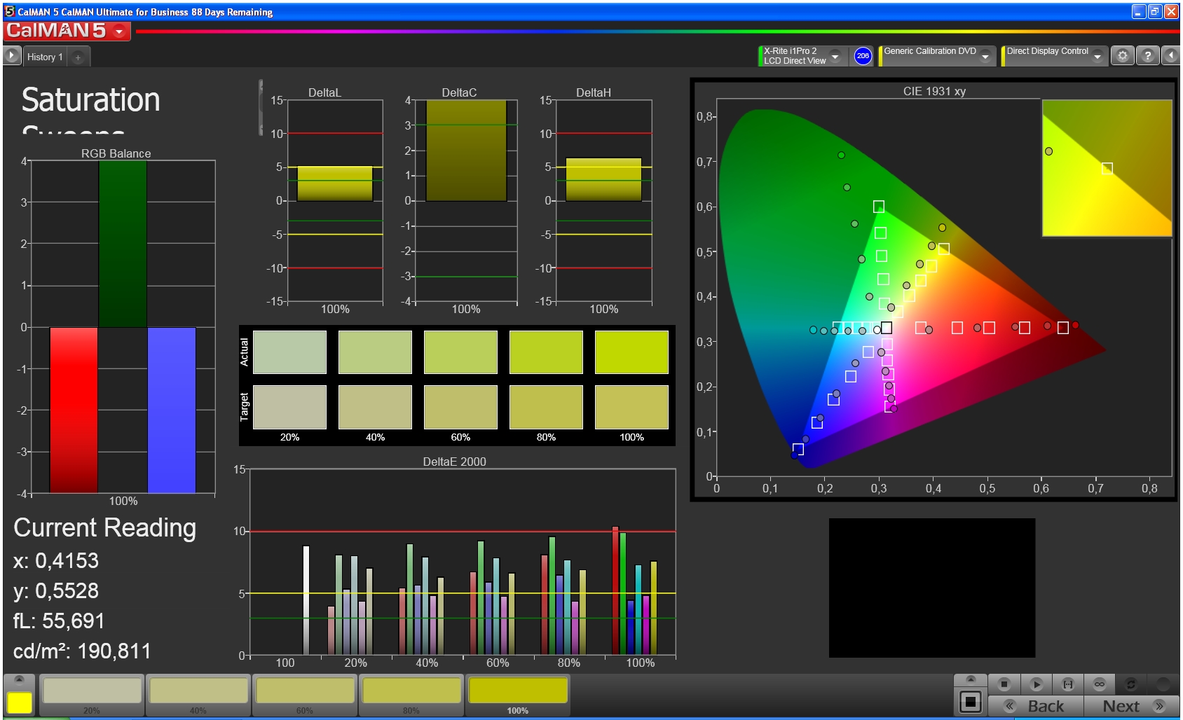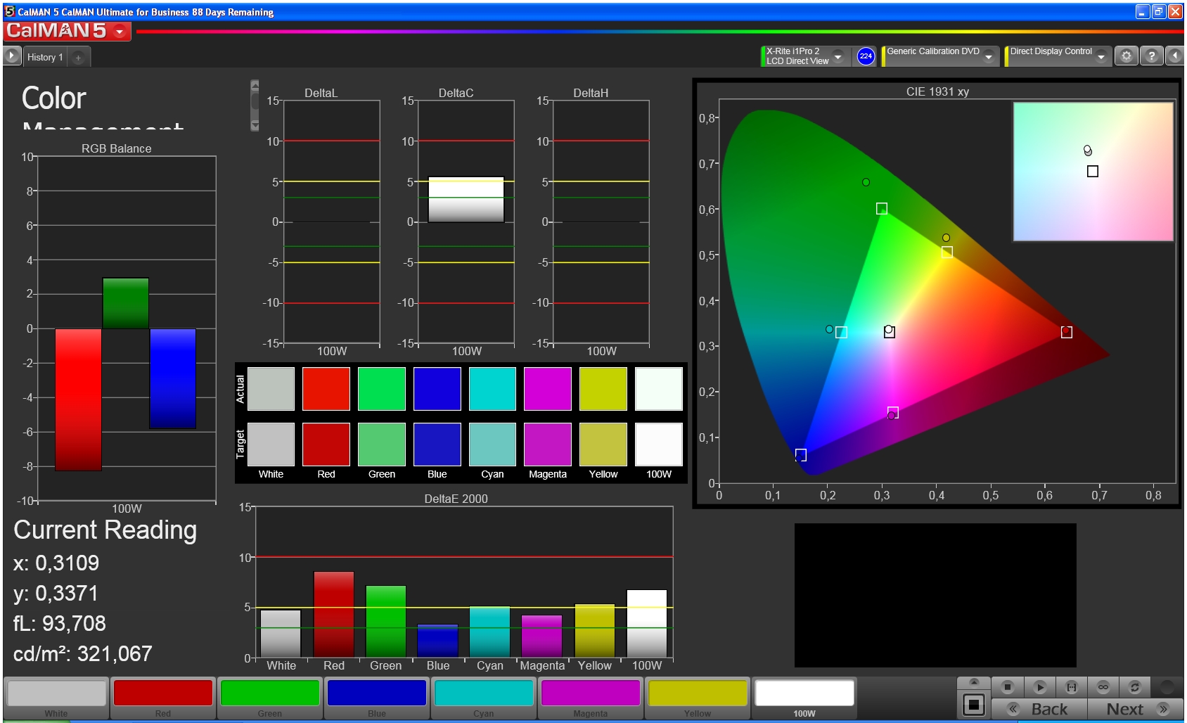 In den Systemeinstellungen kann zwischen zahlreichen Displaymodi umgeschaltet werden. Neben dem Standardprofil kann „Dynamisch“, „Foto“ und „Video“ ausgewählt werden. Mit der Zusatzoption „Foto AdobeRGB“ ist es möglich, eine besonders hohe Farbraumabdeckung darzustellen. Über alle Einstellungen hinweg fällt auf, dass „Rot“ zu blass dargestellt wird. Ebenfalls kommt die Farbintensität anderer Farben etwas zu kurz. Das satteste Ergebnis kann mit dem Modus „Video“ erzielt werden. Die Graustufendarstellung ist sehr deckungsgleich mit der Referenzkurve, solange man von dem Dynamikmodus Abstand hält. Die Graustufen betreffend, kann hier kein zufriedenstellendes Bild abgeliefert werden, denn die Farbtemperaturen weichen vom Soll-Wert ab.