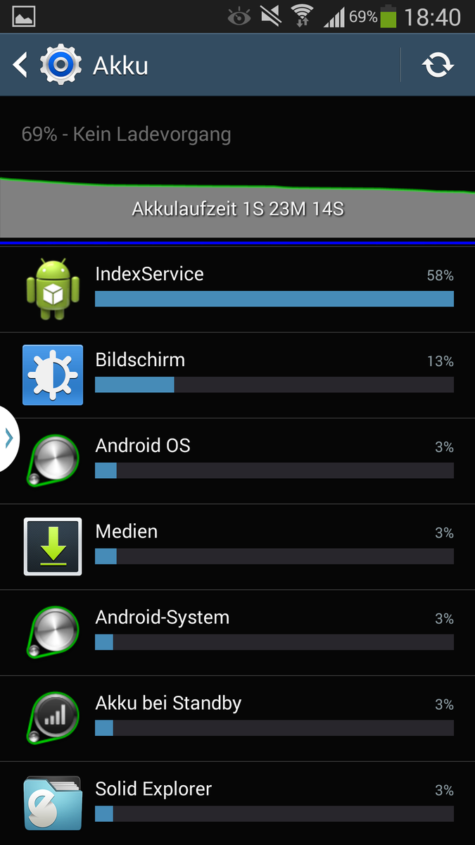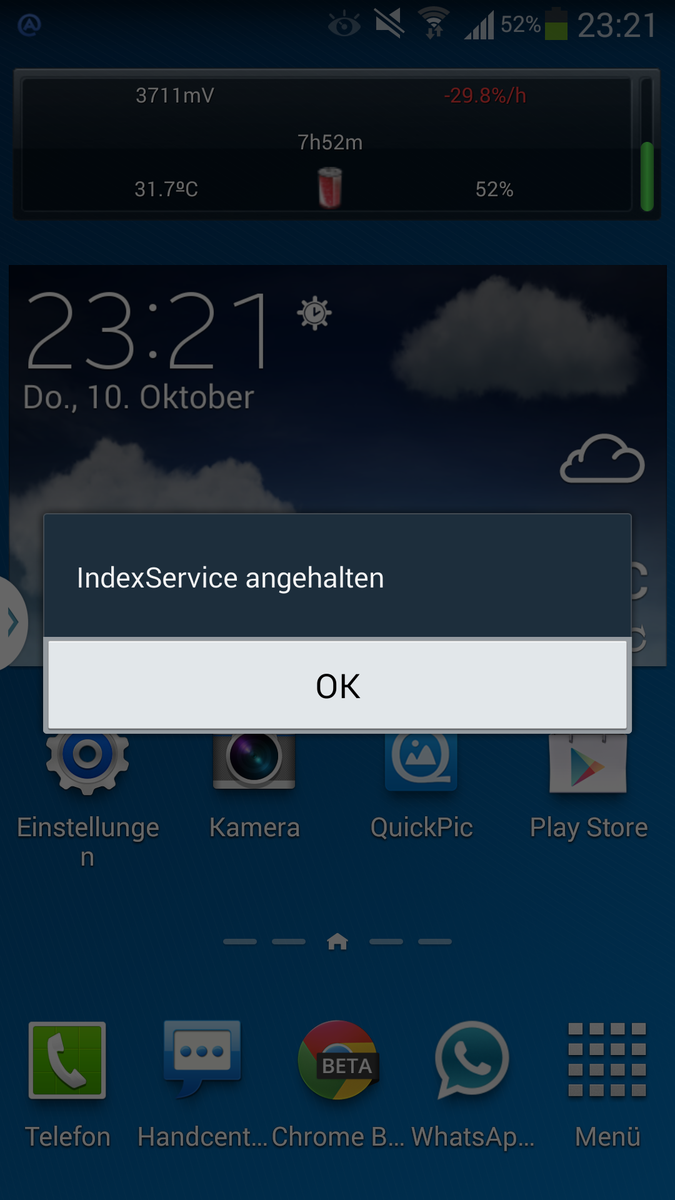 Direkt nach dem ersten Einschalten wurden wir bereits aufgefordert, ein Systemupdate herunterzuladen. Bereits nach einer Woche kam dann das zweite Update. Mittlerweile arbeitet das Google Betriebssystem in Version 4.3 auf dem Testgerät. Negativ fiel uns bereits zu Testbeginn ein größerer Fehler auf. Der Akkuverbrauch war extrem hoch und nach jeder vergangenen Minute ereilte uns eine Fehlermeldung – „Index Service angehalten“. Dieser Fehler hatte zur Folge, dass die Funktion des Smartphones für wenige Sekunden außer Gefecht gesetzt war. Nach ein paar Tagen stellte sich heraus, dass die eingelegte SD-Karte dafür verantwortlich war. Auch ein Formatieren der Karte brachte zunächst keine Verbesserung. Erst das komplette Entfernen der Speicherkarte konnte den Fehler vollends beseitigen. Hier muss der Hersteller schleunigst nachbessern, denn durch die permanent andauernde Indexierung ist der SoC stark ausgelastet.