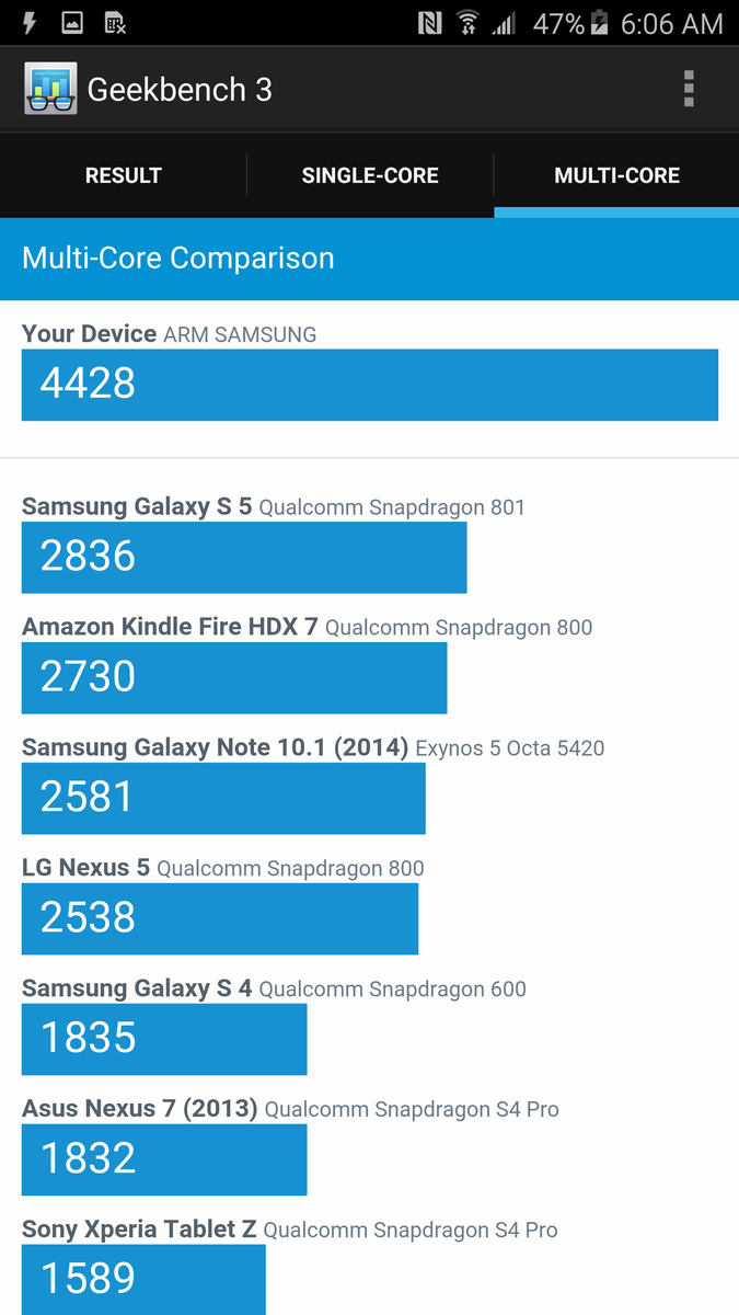 Samsung hat den Snapdragon 805 des Note 4 zu Gunsten des eigenen 14 nm Exynos 7420 SoC, den man auch im Galaxy S6 antrifft, ersetzt. Daher ist die reine Leistung im Wesentlichen mit dem Galaxy S6 gleichauf, und wir verweisen auf unseren vollständigen Test des S6 für zusätzliche Informationen und Benchmarks dieses Prozessors.