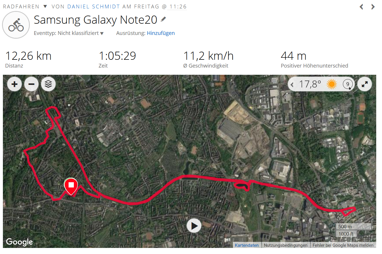 Auf einer kleinen Radtour muss das Samsung-Smartphone gegen das Garmin Edge 500 antreten. Auf einer Strecke von über zwölf Kilometern liegen die beiden Geräte 150 Meter weit auseinander. Im detaillierten Streckenverlauf liegt das Note20 zwar manchmal etwas neben der Strecke, macht seine Sache unterm Strich aber recht gut.