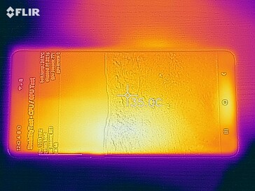 Die Oberflächentemperaturen des Samsung Galaxy S10+ liegen bei der Version mit Keramikrückseite selbst im Leerlauf flächendeckend über der 30-Grad-Marke. Unter Last erwärmt sich das Samsung-Handy deutlich und erreicht auf der Front im Bereich des SoC einen Spitzenwert von 39,3 °C, welche wir mit dem Infrarot-Thermometer gemessen haben, bei einer Kontaktmessung fällt der Wert etwas niedriger aus und erreicht lediglich 37,7 °C. Beides ist spürbar, aber absolut unbedenklich.