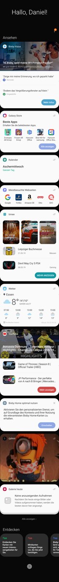 Bixby wurde, wie schon im Abschnitt Software genauer beschrieben, tiefer in das System integriert. Bixby-Home bietet eine schnelle Übersicht über alle wichtigen Dinge und kann mit einem einfachen Wischen nach links auf dem Homescreen aufgerufen werden. Der Bixby-Button ist auch mit dem neuesten Update fest mit dem Sprachassistenten der Koreaner verknüpft und lässt sich nicht fix mit einem anderen Assistenten verknüpfen. Der Button lässt sich jedoch erweitert konfigurieren und zusätzlich zum einfachen Drücken, kann ein doppeltes Drücken als Eingabemöglichkeit vergeben werden. Eine der beiden Möglichkeiten ist allerdings immer an Bixby geknüpft, während die andere entweder den Start einer App oder einen Schnellbefehl auslöst. Andere Sprachassistenten lassen sich aber auch so bislang nicht mit der Taste verknüpfen, außerdem lässt sie sich auch nicht mehr vollständig deaktivieren.