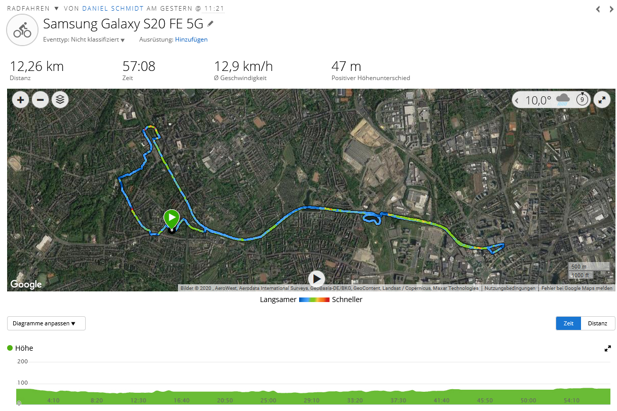 Auf einer rund 12 Kilometer langen Fahrradtour muss der jüngste Galaxy-S20-Sproß anschließend beweisen, ob er die Standortbestimmung in Bewegung genauso gut hinbekommt. Ergebnis: Apps versorgt das Smartphone mit ziemlich genauen Positionsdaten, denn es arbeitet fast so genau wie das Profi-Navigationsgerät Garmin Edge 500, das die Strecke zum Vergleich mitfährt.