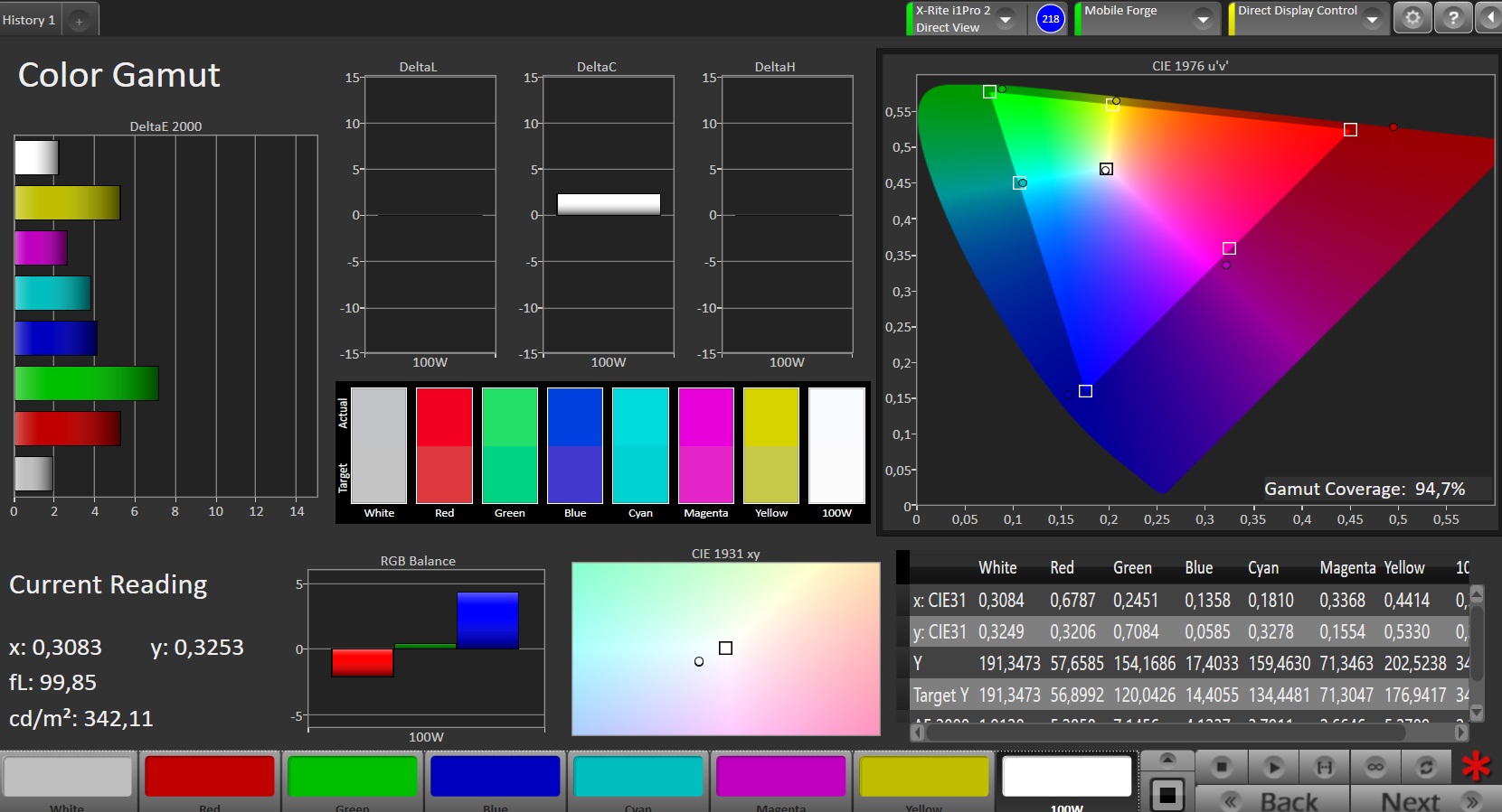 | Colorchecker dE 2000 max. * | 4.52 | 2.4 47% | 10.3 -128% | 6.12 -35% | 5.5 -22% | 6.83 -51% |