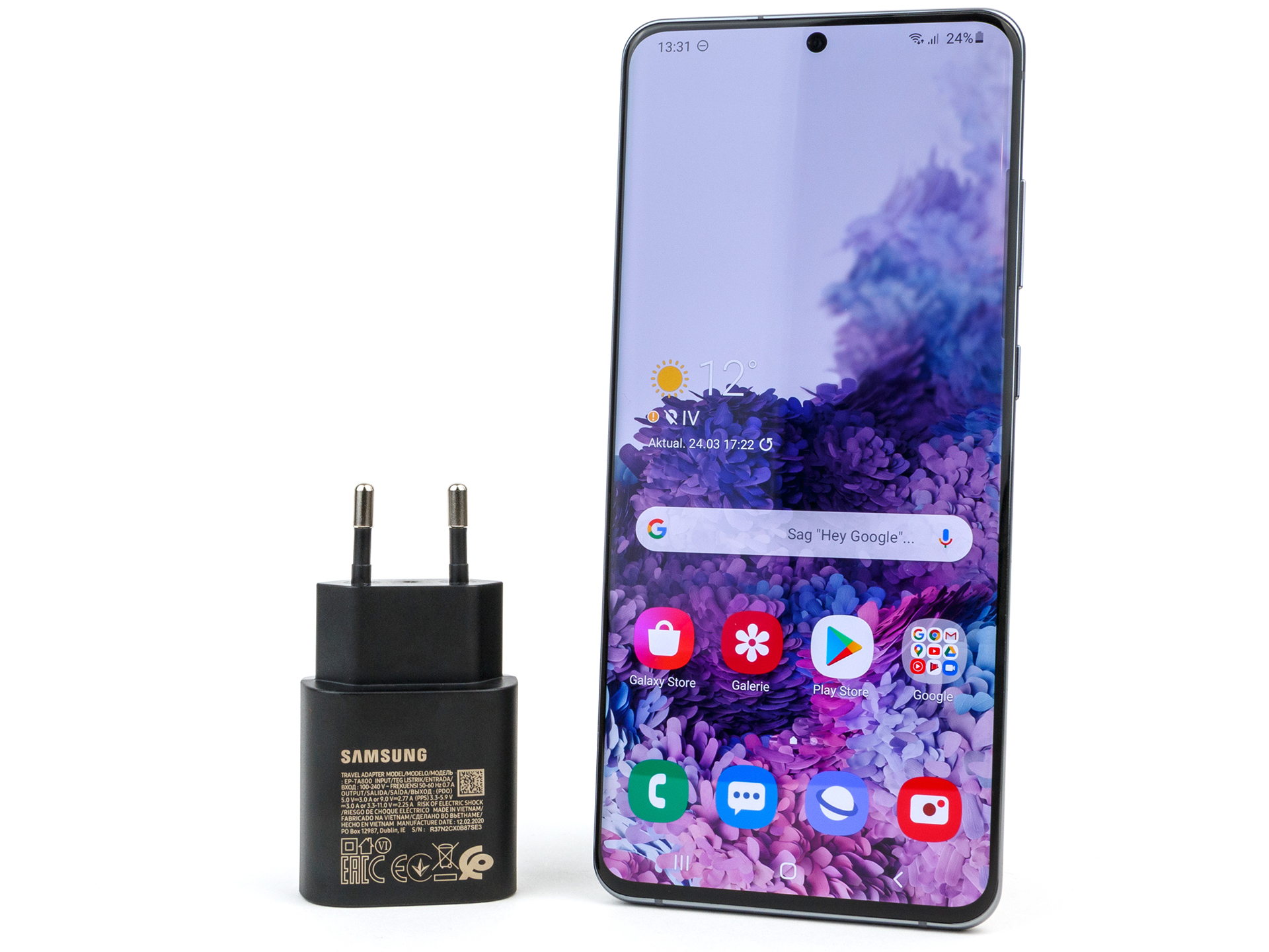 Samsung verwendet ausschließlich Corning Gorilla Glas 6 auf beiden Seiten. Die Farbe des Kartenschlitten ist nicht identisch mit der des Rahmens, wenn auch die Unterschiede minimal ausfallen. Der Kartenschlitten kann entweder zwei Nano-SIM-Karten oder statt der zweiten SIM eine microSD-Karte aufnehmen. Das Samsung-Handy ist gemäß IP68 gegen das Eindringen von Staub und Wasser geschützt. Bereits ab Werk ist eine Schutzfolie auf dem Display aufgebracht.