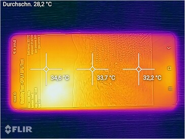 Die Oberflächentemperaturen des Samsung Galaxy S20 Ultra sind im Leerlauf stellenweise bereits über der 30-Grad-Marke, steigen dafür aber selbst unter andauernder Last nicht höher als 35 °C.