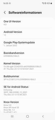 Das Samsung Galaxy S21 FE 5G wird mit Google Android 12 und der hauseigenen Benutzeroberfläche One UI 4.0 ausgeliefert. Zum Zeitpunkt des Tests sind die Sicherheitsupdates auf dem Stand vom 1. Januar 2022 und damit aktuell, außerdem gilt auf dieses Smartphone das Updateversprechen für vier Jahre und drei Android-Updates, sodass sogar Android 15 noch ausgerollt werden sollte.