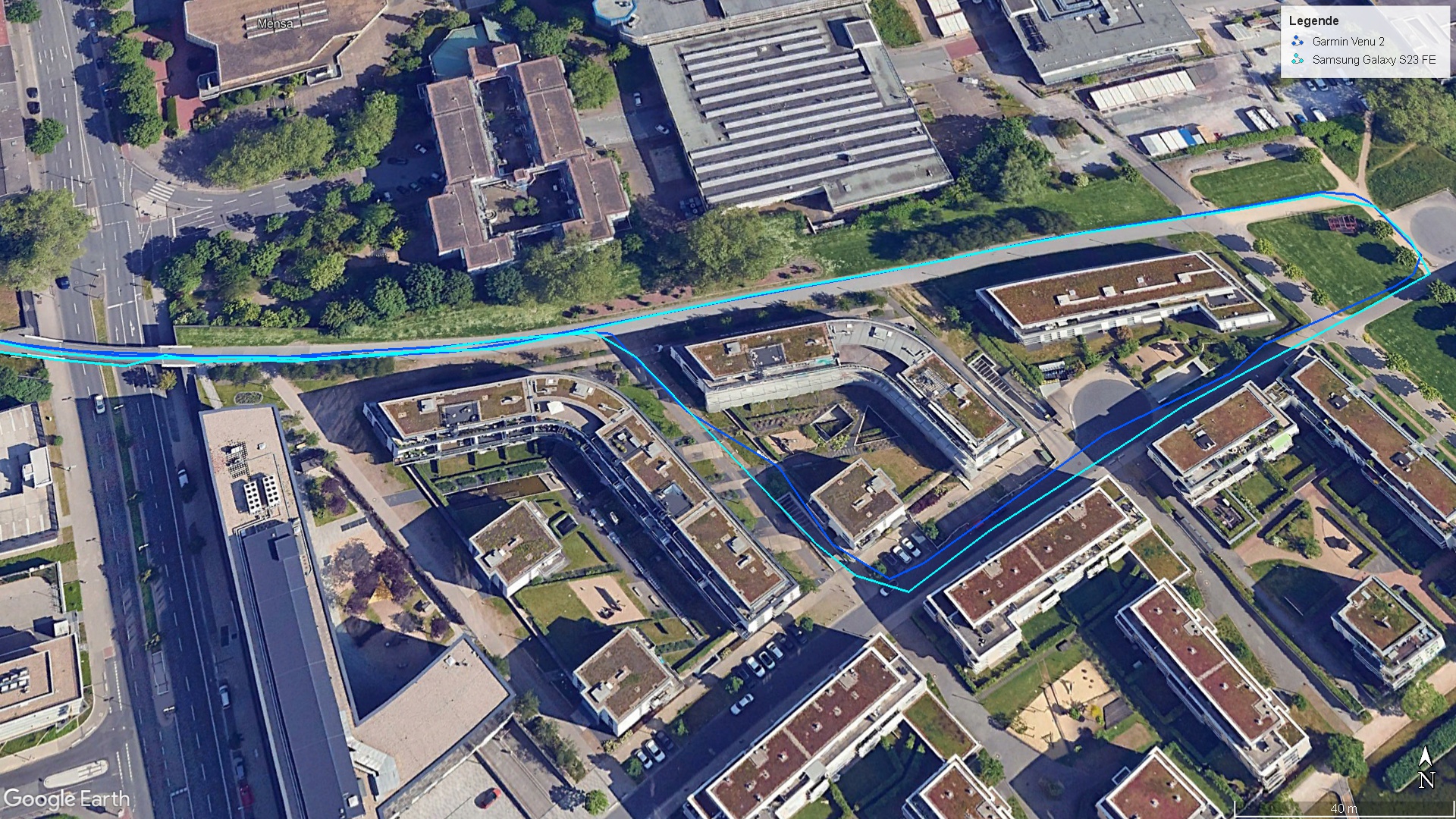 Während einer Runde mit dem Fahrrad vergleichen wir das Samsung-Handy mit einer Garmin Venu 2. Die Fitness-Smartwatch ist zwischen den Gebäuden zwar etwas genauer, im Gegenzug besitzt das S23 FE bei der Seeumrundung eine höhere Präzision und liefert insgesamt eine richtig gute Ortung.