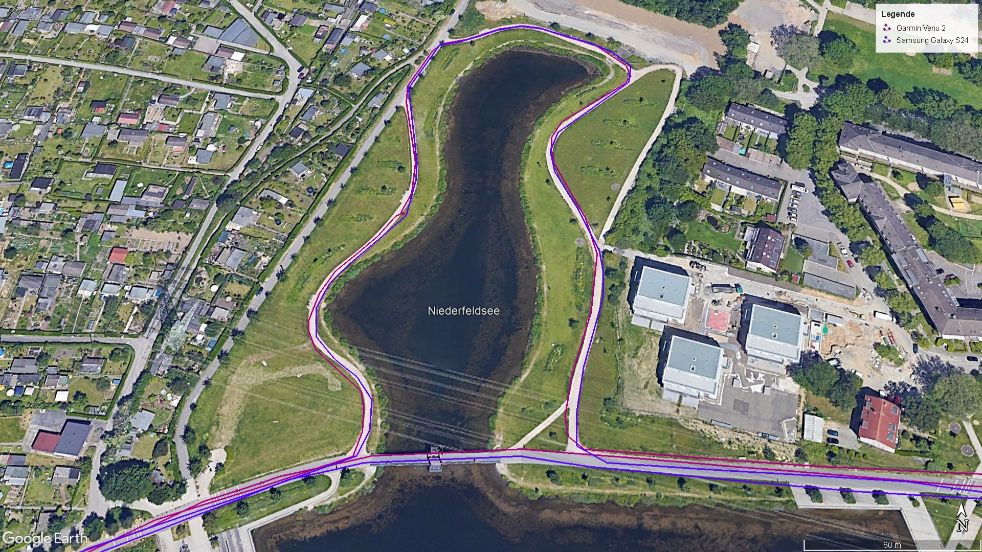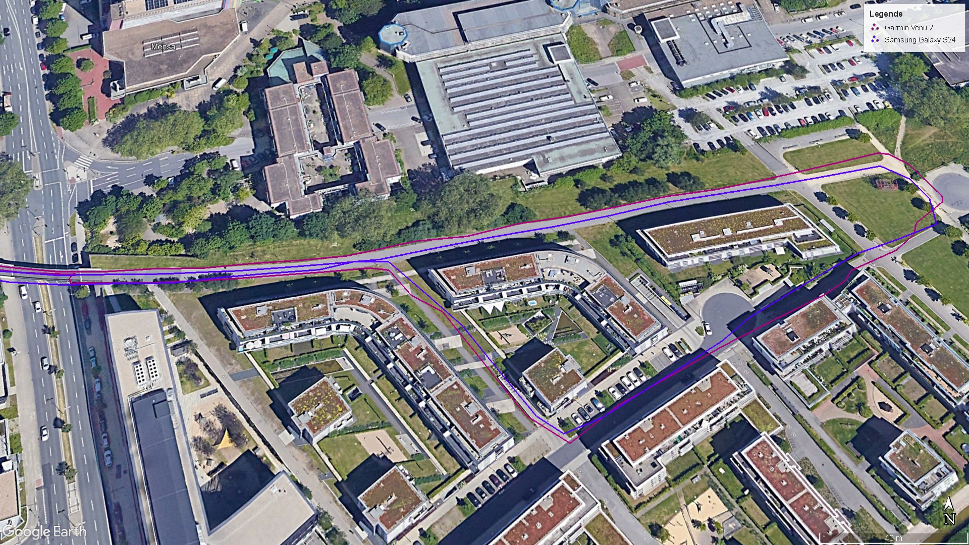 Die Positionsbestimmung in unserem Praxistest ist nicht immer perfekt, aber doch sehr gut. Geringe Abweichungen zur Wegstrecke sind zwar erkennbar, die zu Vergleichszwecken genutzte Garmin Venu 2, liefert allerdings mitunter einen ungenaueren Verlauf.