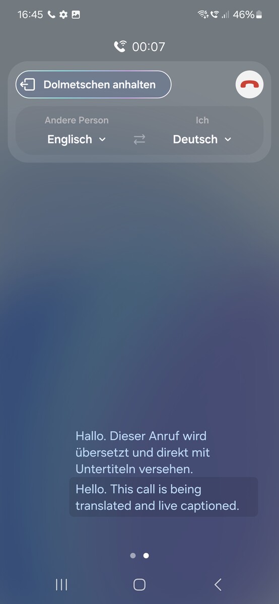 Auch bei der Telefonie kommt die neue Galaxy AI zum Einsatz. Mit der Funktion „Live Übersetzung“ übersetzt das Galaxy S24 geführte Telefonate über die Samsung-Telefon-App in Echtzeit – und dies direkt auf dem Galaxy-Smartphone ohne Datenverbindung. „Echtzeit“ ist allerdings ein sehr dehnbarer Begriff, denn bei unserem Test dauert es schon ein bis zwei Sekunden bis kurze Sprachinhalte übersetzt werden. Gerade wenn die Originalstimmen entfernt werden, ergeben sich (noch) lange Pausen. Im Großen und Ganzen ist die Live-Übersetzung aber eine sehr interessante und vor allem alltagstaugliche Funktion.