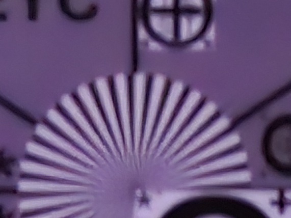 Details in unserem Testchart wirken bei voller Größe ansprechend scharf und Farbverläufe werden sehr sauber dargestellt. Nur zu den Rändern offenbart der 50-MPix-Sensor eine Unschärfe und die feine Textur der Tafel geht verloren.