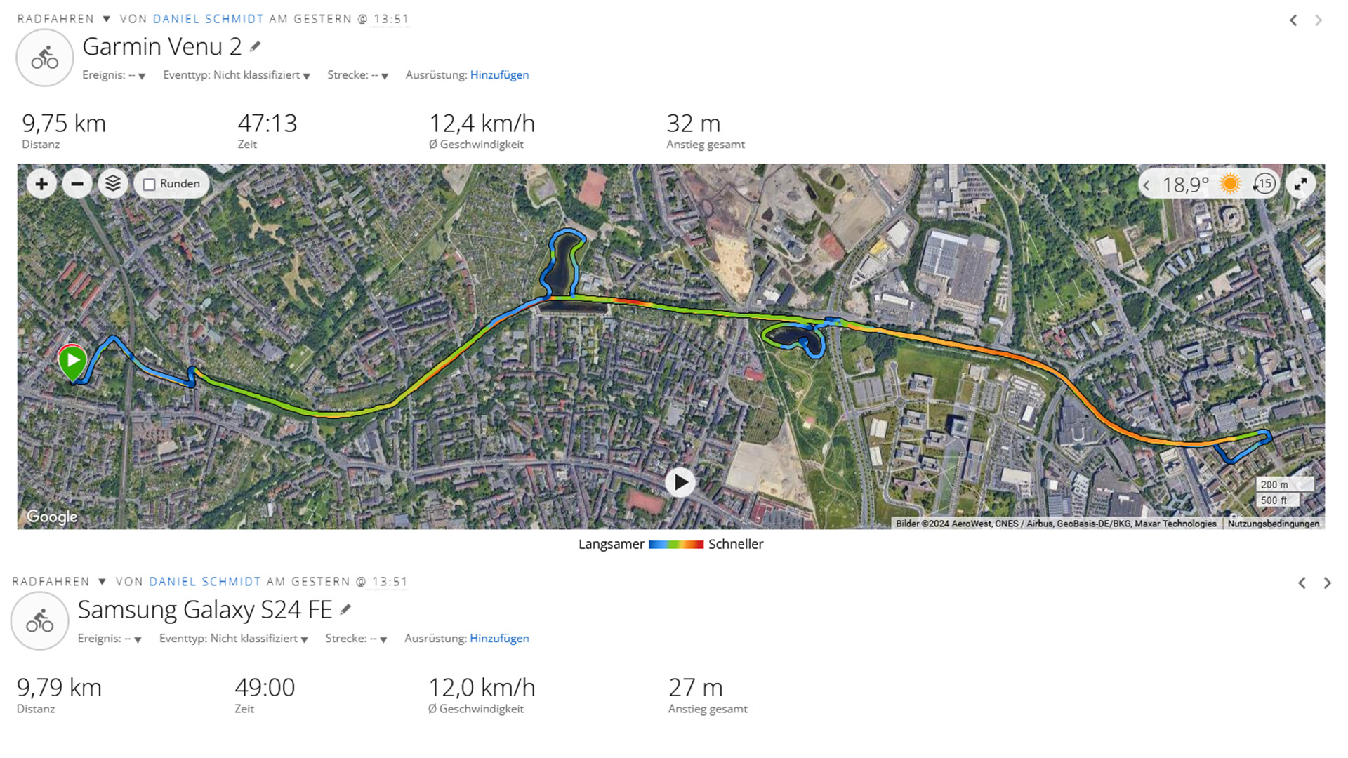 Die Positionsbestimmung ist, gemessen an unserem Vergleichsgerät (Garmin Venu 2), überzeugend, dennoch sind in der Aufzeichnung kleinere Ungenauigkeiten zu erkennen. Wir messen mit dem Galaxy S24 FE, auch dank Dual-Band-GNSS, aber nur geringe Abweichungen zur Wegstrecke.