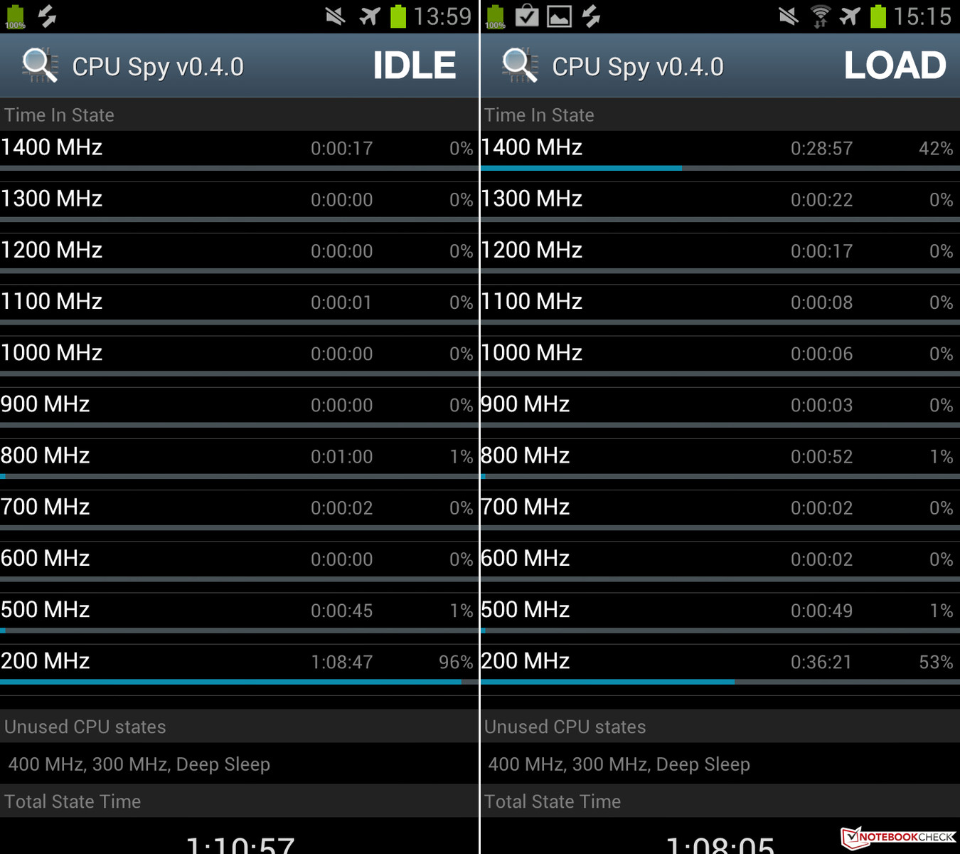 Um Grafikangelegenheiten kümmert sich die ARM Mali-400 MP4 GPU mit 4 Fragmen Prozessoren in der größten Ausbaustufe, die ein Bestandteil des Exynos 4 Quad SoC ist und mit einer Taktfrequenz von 440 MHz arbeitet und sich in den folgenden Benchmarks mit dem Nvidia Tegra 3 SoC des HTC One X messen muss. Leider setzt Samsung nicht auf die neuere Mali-T604 GPU. Bevor es aber an einen Leistungsvergleich geht, haben wir uns noch das Taktverhalten des SoC mittels CPU Spy angesehen. Im normalen Betrieb arbeitet das System meist mit stromsparenden 200 MHz. Unter Last (Stability Test) wird die maximale Taktfrequenz des SoC zu knapp 40 Prozent genutzt. Im Idle-Zustand ist der Nvidia Tegra 3 Chip des HTC One X im Vorteil, da er zum größten Teil mit 100 MHz arbeitet und dadurch weniger Strom verbraucht, aber dazu später mehr.