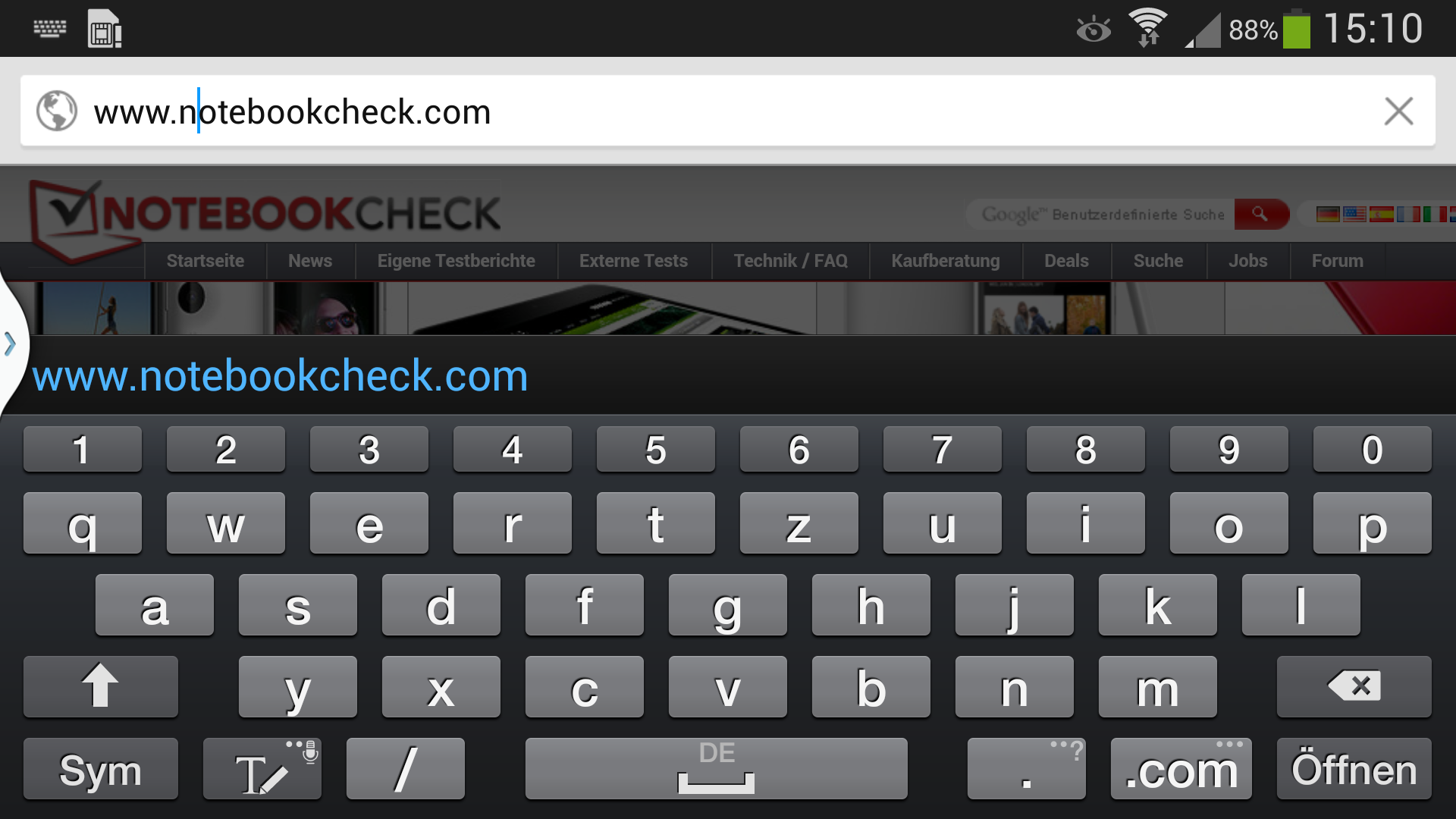 Der kapazitive Touchscreen erkennt bis zu zehn Berührungen gleichzeitig. Er arbeitet zuverlässig und präzises. Dies ist aber auch notwendig, denn das von Samsung eingebettete Tastatur-Layout bedient sich im Hochformat optisch recht kleiner Tasten, die sich jedoch überraschend gut treffen lassen und somit kaum Tippfehler produzieren. Dabei wird der durch die Display-Diagonale von 5,0 Zoll und die Full-HD-Auflösung zur Verfügung gestellte Platz gut genutzt und über der QWERTZ-Tastatur eine extra Reihe für Zahlen spendiert. Prima, das spart lästiges Umswitchen.