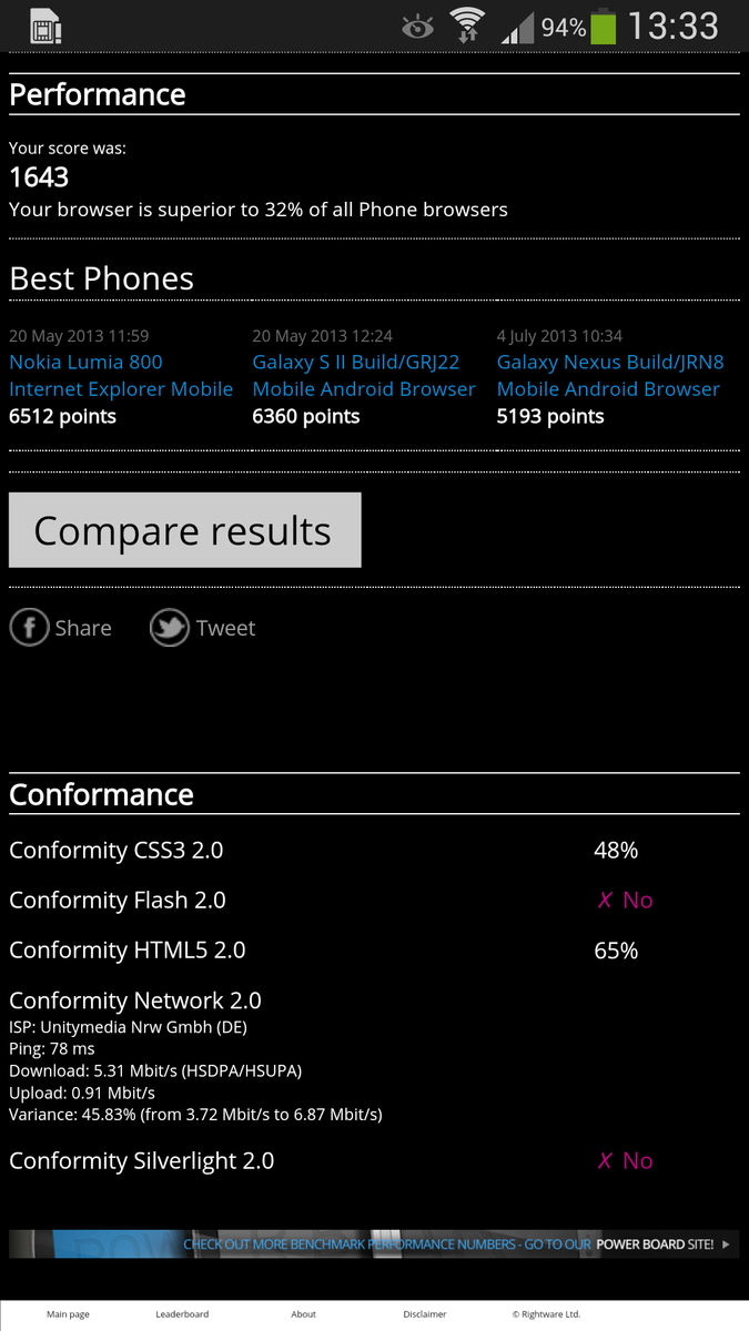 Die Browser-Leistung ist sehr gut. In den meisten Benchmarks schneidet Samsungs Outdoor-Bolide sogar besser ab als das hauseigene Flaggschiff. Es ist oft auch besser als das iPhone 5 oder das Lumia 925. Dies wird aber nicht nur an dem leistungsstarken SoC, sondern vor allem auch am verwendeten Browser (Google Chrome 28) liegen.