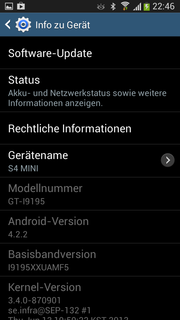 Befeuert wird das Galaxy S4 Mini von Android 4.2.2 (Jelly Bean). Dank der TouchWiz-Benutzeroberfläche ist von dem ursprünglichen Android-Betriebssystem nicht mehr sonderlich viel zu erkennen. Besonders umfangreiche Anpassungen gab es in den Systemeinstellungen. Die eigentlichen Untermenüs sind in vier Einheiten unterteilt: „Verbindungen“, „Mein Gerät“, „Konten“ und „Optionen“.