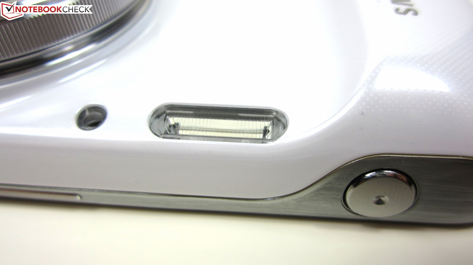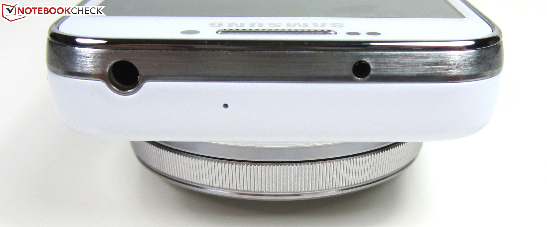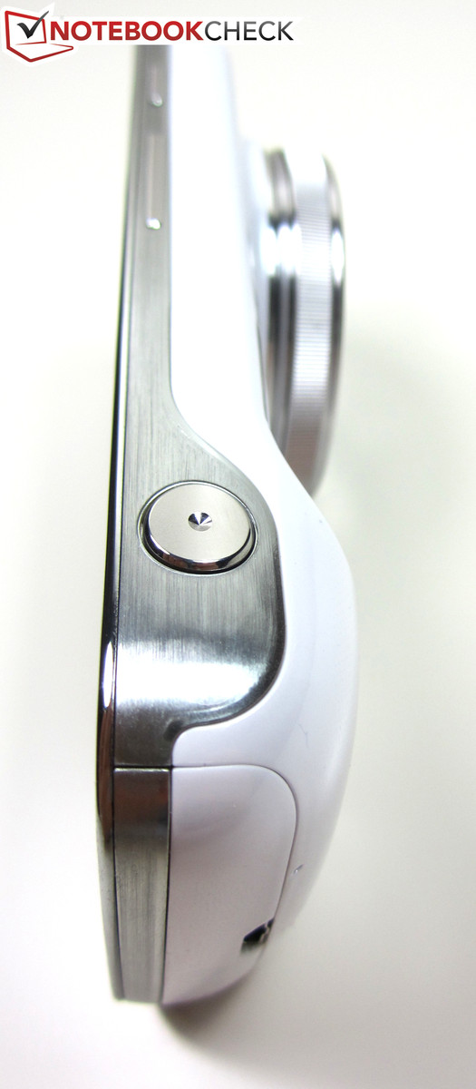 Die Gehäuserückseite hat mit typischer Smartphone-Optik nichts mehr gemein, sondern hier sieht das in schwarzem und weißem Gehäuse erhältliche Galaxy S4 Zoom wie eine typische Kompaktkamera aus. Größten Anteil daran hat natürlich das Zehnfach-Zoomobjektiv, das deutlich sichtbar aus dem Chassis herausragt und dem Smartphone eine noch „hosentaschentaugliche“ Gehäusetiefe von etwa 2,8 Zentimetern verleiht. Im Querformat gehalten lässt sich das Galaxy S4 Zoom konsequenterweise auch wie eine Kompaktkamera bedienen. Ein Kameragriff auf der rechten Seite sorgt für sicheren Halt der Finger und auf der Oberseite (im Hochkantformat die rechte Gehäuseseite) befindet sich der Auslöseknopf.