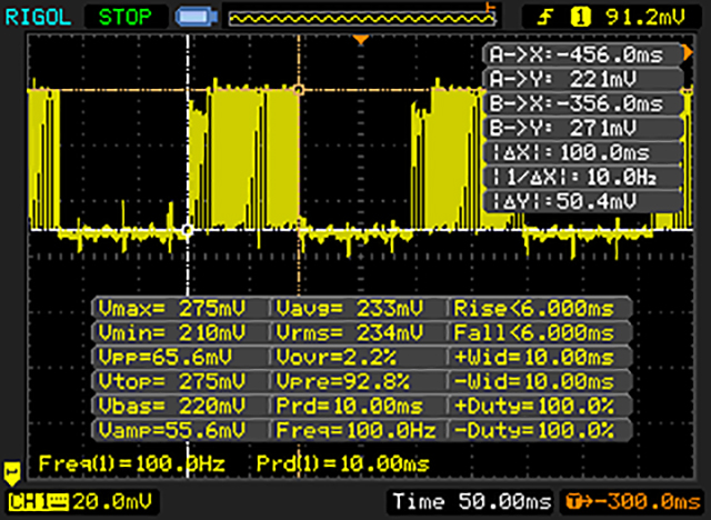 Das Display flackert mit 240.4 Hz (im schlimmsten Fall, eventuell durch Pulsweitenmodulation PWM) . Die Frequenz von 240.4 Hz ist relativ gering und daher sollte es bei sensiblen Personen zu Problemen wie Flackern oder Augenbeschwerden führen. Im Vergleich: 53 % aller getesteten Geräte nutzten kein PWM um die Helligkeit zu reduzieren. Wenn PWM eingesetzt wurde, dann bei einer Frequenz von durchschnittlich 8125 (Minimum 5, Maximum 343500) Hz. | |||