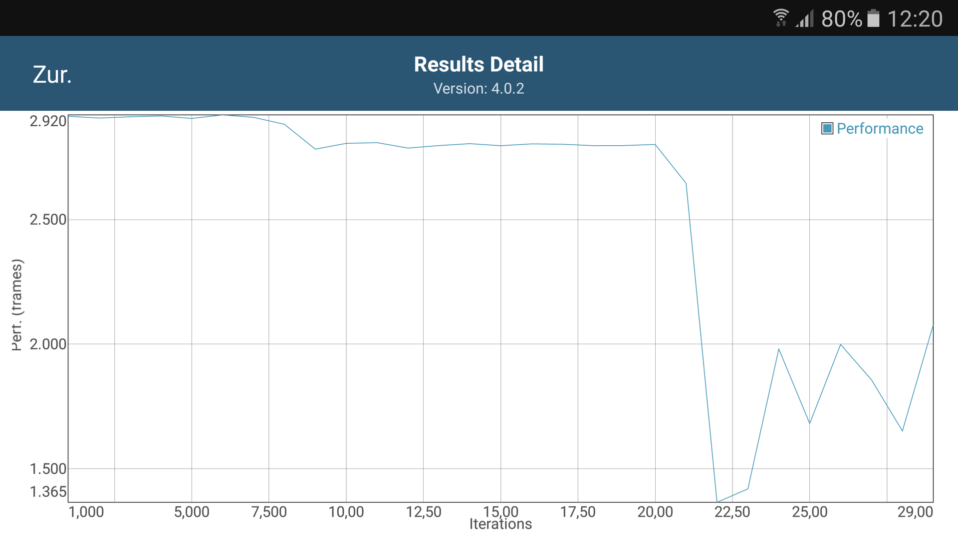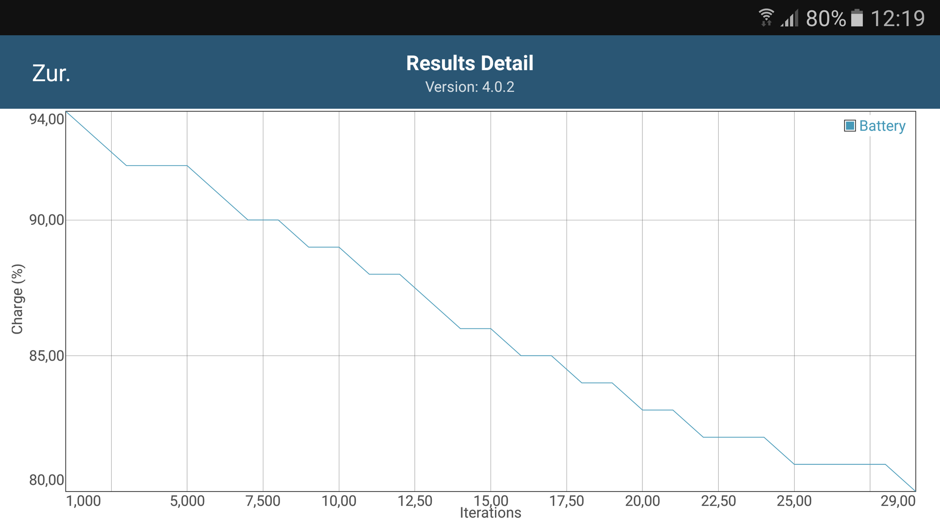 Relevant ist aber auch, was unter der Abdeckung passiert. Mit dem GFXBench Akku-Test haben wir deshalb die Leistungsstabilität des SoCs unter andauernder Last getestet. Dabei wird der T-Rex-Test dreißigmal in Folge ausgeführt und neben dem Akkustand auch die Frameraten protokolliert. Nach zwei Dritteln des Tests beginnt das Throttling und die Performance bricht um rund 54 Prozent ein. Etwas später berappelt sich das System wieder ein wenig und die Leistung schwankt zwischen 58 und 69 Prozent der Ursprungsperformance.