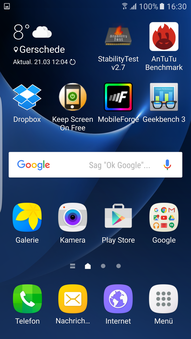 Das Samsung Galaxy S7 Edge besitzt einen 5,5 Zoll großen kapazitiven Touchscreen, welcher extrem empfindlich ist und bis zu zehn gleichzeitige Berührungen erkennen kann. Die Eingaben werden schnell und zuverlässig umgesetzt. Ein druckempfindliches Dsiplay, wie beim iPhone 6s Plus, besitzt das S7 Edge nicht. Da das Smartphone gemäß IP68 vor Staub und Wasser geschützt ist, haben wir uns das Verhalten des Touchscreens auch im feuchten Nass angeschaut. Die Berührung von Wasser kann auch Eingaben auf dem Screen auslösen, was soweit nicht ungewöhnlich ist. Unter Wasser funktioniert dies jedoch nur sehr schlecht, dafür kann die Kamera jedoch mit einem Doppelklick auf den Homebutton gestartet werden. Als Auslöser lassen sich die Lautstärketasten nutzen.