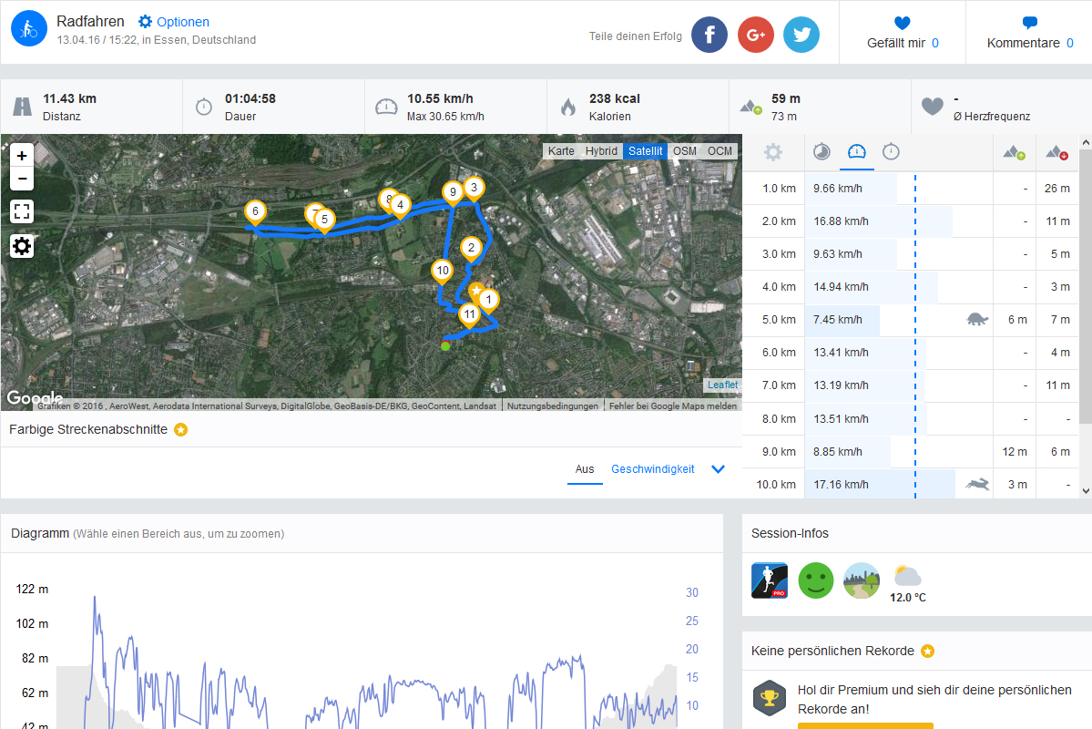 Das integrierte GPS-Modul, welches auch das Satellitennetzwerk Glonass unterstützt, fand sowohl im Freien als auch in einem Supermarkt schnell die aktuelle Position. Im Inneren einer Wohnung im dritten Stock eines Mehrfamilienhauses mit insgesamt 4 Etagen war hingegen keine Ortung mehr möglich. Bei einer Testfahrt zeigte das Galaxy Tab A7 im direkten Vergleich zum GPS-Fahrradcomputer Garmin Edge 500 geringe Abweichungen in schwierig zu erfassenden Streckenabschnitten wie z. B. im Bereich der Bahnunterführung oder dem westlichen Wendepunkt. Insgesamt addieren sich diese kleinen Ungenauigkeiten auf lediglich 180 Meter bzw. deutlich unter 2 % der gefahrenen Gesamtstrecke. Zum Navigieren sollte das Tablet demnach problemlos geeignet sein.
