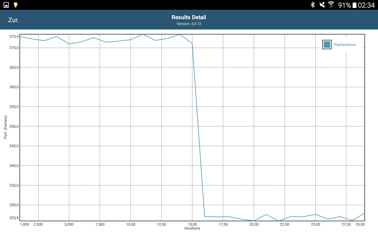Um die Stabilität der Performance unter anhaltender Last zu überprüfen, haben wir den Akkutest von GFXBench ausgeführt, der den T-Rex-Test dreißigmal hintereinander ablaufen lässt. Da es sich beim verbauten Spreadtrum SoC um kein besonders leistungsstarkes Modell handelt, waren hier eigentlich kaum Einbrüche zu erwarten. Dennoch zeigte sich – je nach Umgebungstemperatur in unterschiedlich schnellem Maße – nach einigen Durchläufen des Tests reproduzierbar ein dauerhafter Leistungsabfall um ca. 13 % des Ausgangswertes.