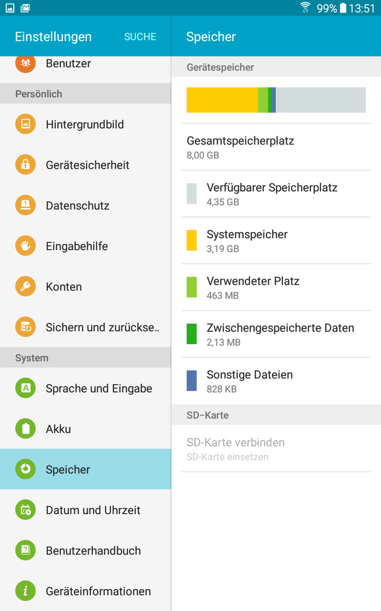 Dass es sich beim Testgerät um ein Einsteigermodell handelt, wird bei der Ausstattung schnell deutlich: Mit nur 1,5 GB RAM sowie lediglich 8 GB internem Speicher fällt diese recht spartanisch aus, insbesondere da dem Nutzer ab Werk nur rund 4,35 GB Speicherplatz zur freien Verfügung stehen. Glücklicherweise besitzt das Tablet aber einen Steckplatz für eine bis zu 200 GB große microSD-Karte, die dank App2SD-Funktion auch von Programmen genutzt werden kann.