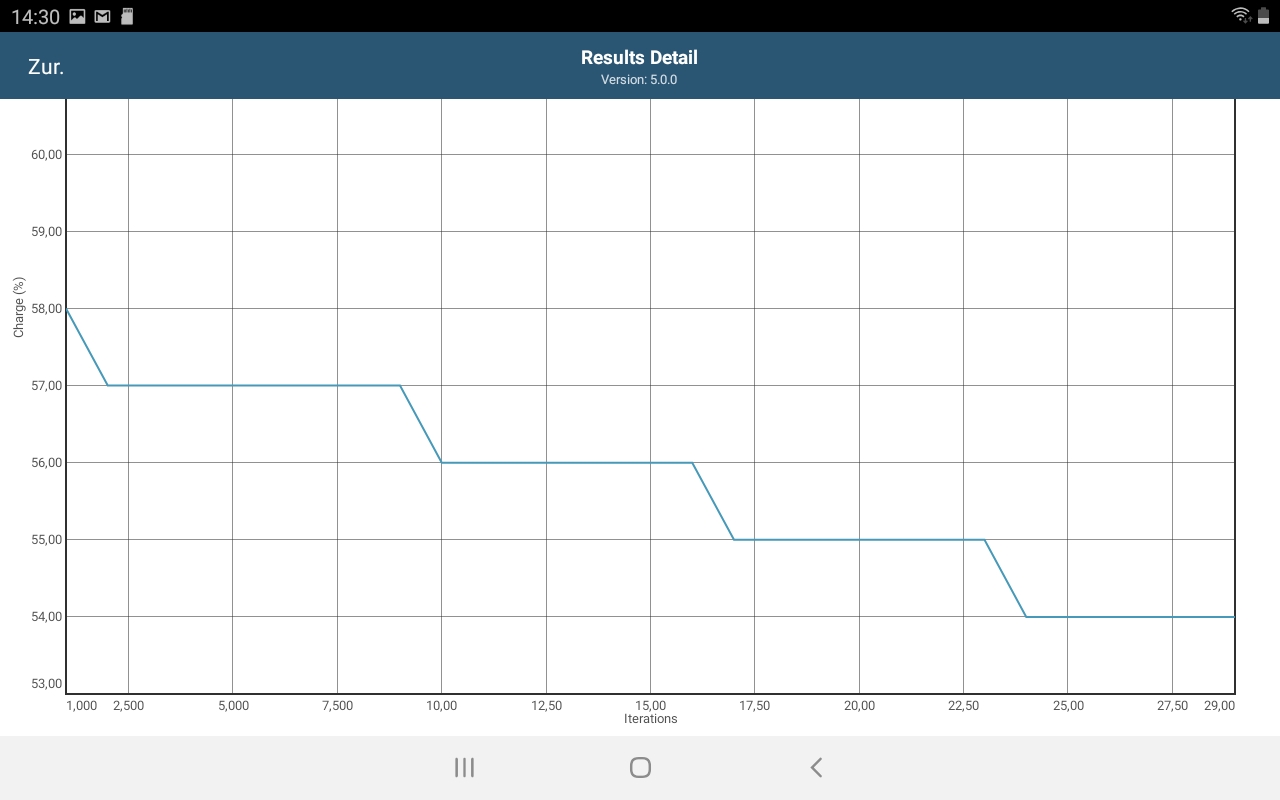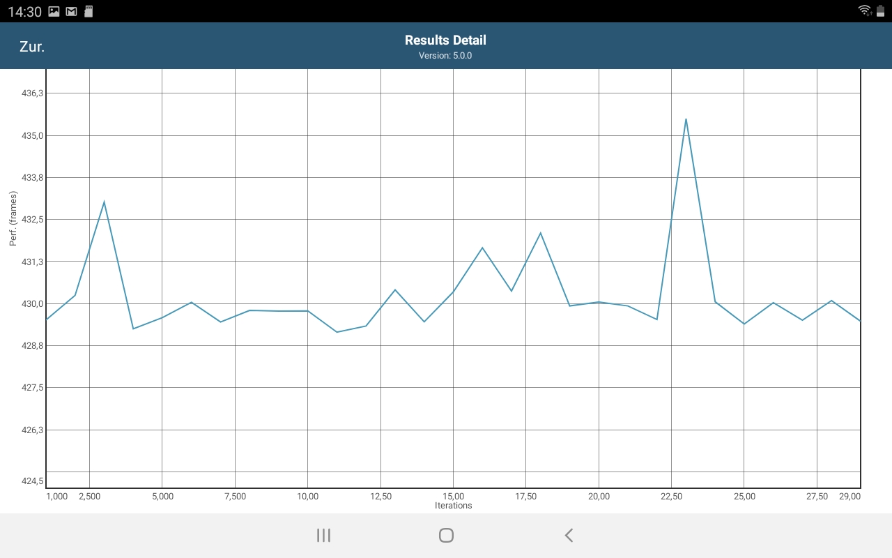 Dies finden wir heraus, indem wir den Akku-Test des GFXBench-Benchmarks auf dem Galaxy Tab A 8.0 (2019) laufen lassen. Hier wird dreißigmal dieselbe Sequenz des anspruchsvollen Mannhatten-OpenGL-ES-3.1-Tests gerendert. Die protokollierten Ergebnisse zeigen zwar eine schwankende Framerate, ein Drosseln der Leistung unter Lastbedingungen ist aufgrund der geringen Reduzierung der Framerate im GFXBench-Benchmark dennoch unwahrscheinlich.