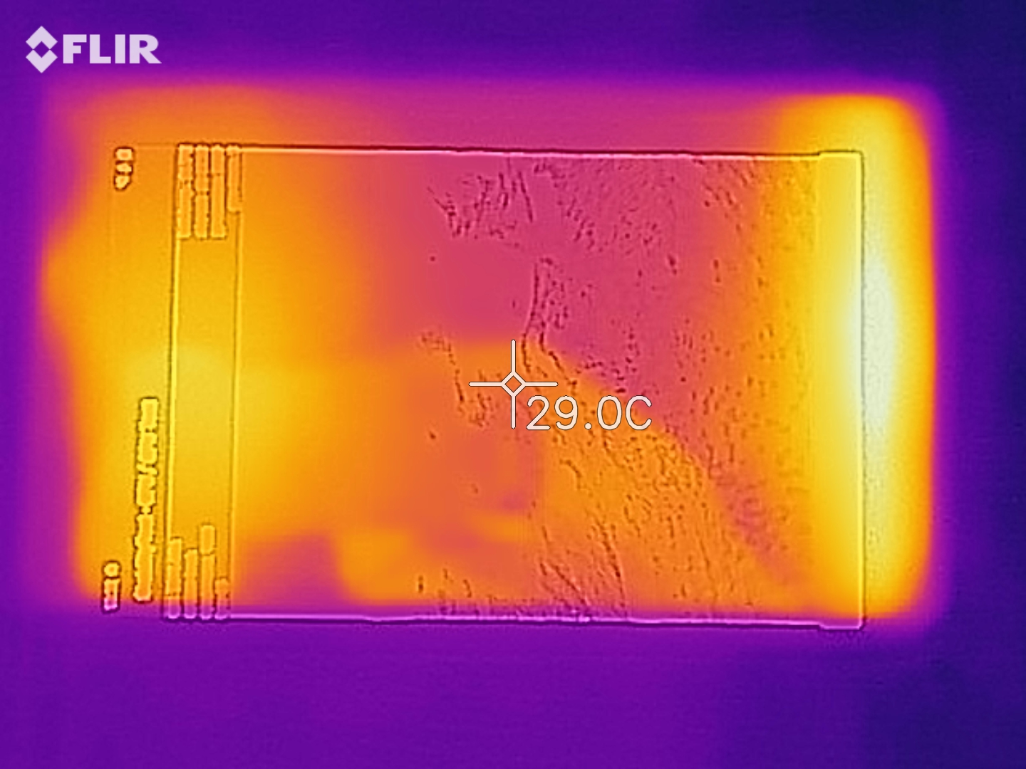 (+) Auf der Unterseite messen wir eine maximalen Wert von 26.9 °C (im Vergleich zum Durchschnitt von 33.2 °C).