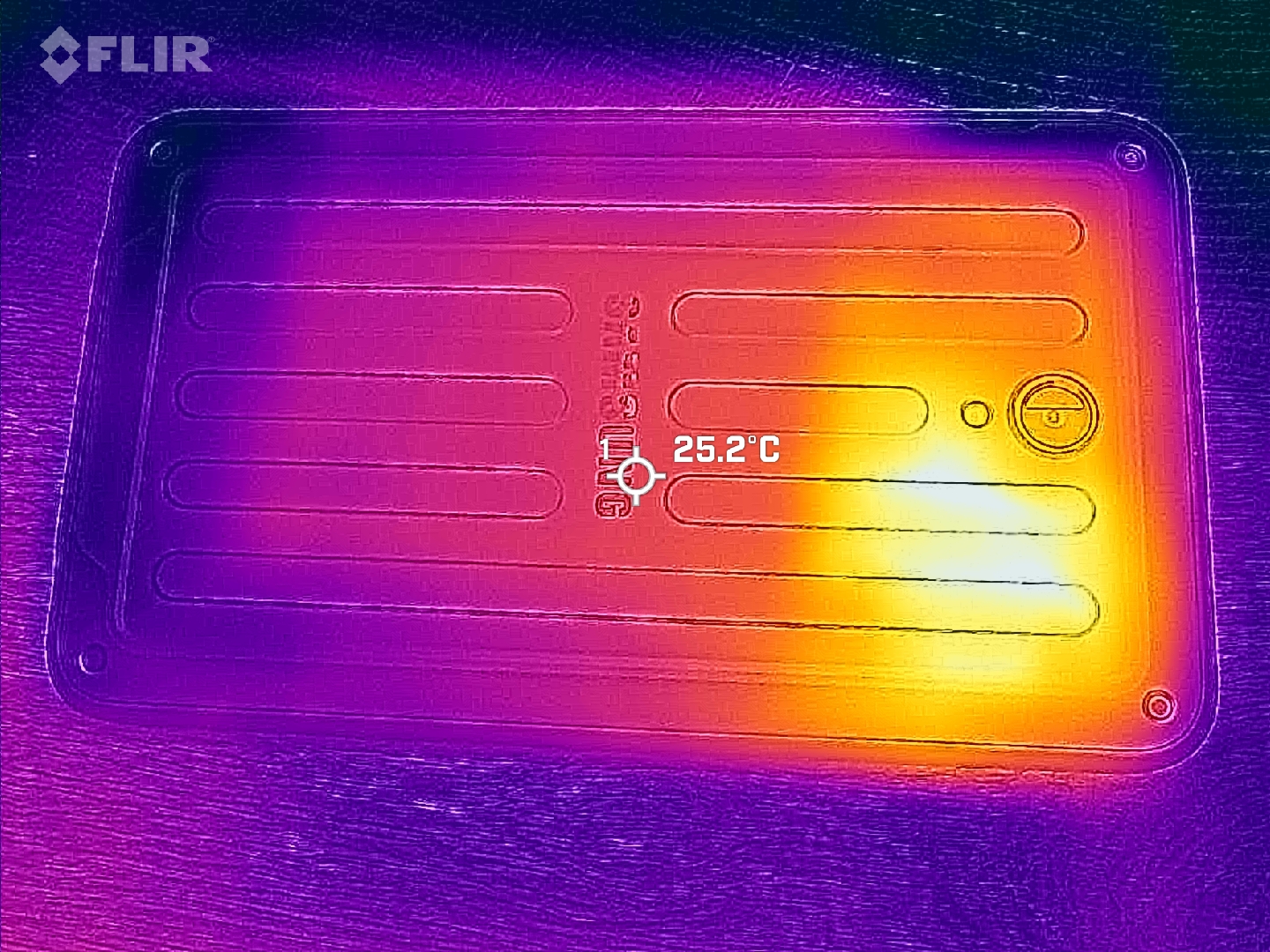 (±) Auf der Unterseite messen wir eine maximalen Wert von 43.2 °C (im Vergleich zum Durchschnitt von 33.2 °C).