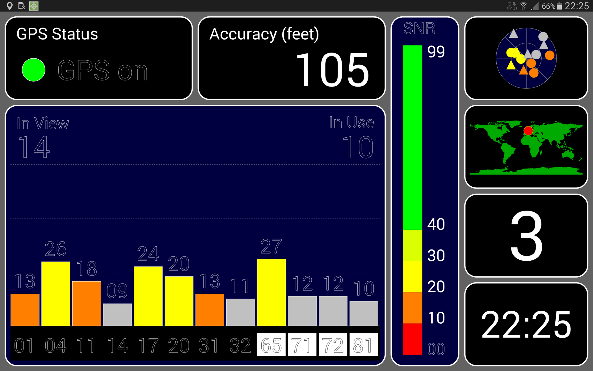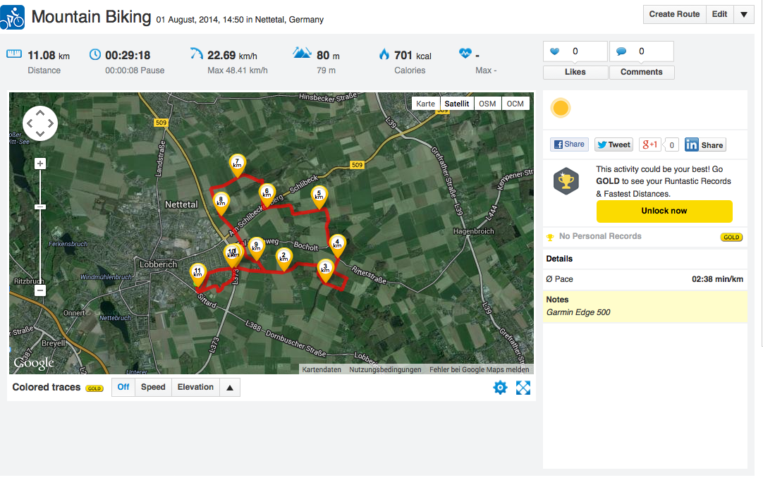 Die Positionsbestimmung erfolgt mittels GPS, Glonass oder dem chinesischen Baidou. Der Satfix erfolgt in geschlossenen Räumen binnen 13 Sekunden. Im Freien werden sogar nur wenige Augenblicke benötigt. Um die Genauigkeit etwas besser beurteilen zu können, haben wir das Samsung Galaxy Tab S 10.5 gegen den Fahrrad-GPS-Computer Garmin Edge 500 antreten lassen. Dessen Genauigkeit wird zwar nicht erreicht, denn vor allem im bewaldeten Gebiet sind deutliche Abweichungen vom Weg zu erkennen. Doch über die gesamte Streckenlänge betrachtet sind die Unterschiede nur minimal, sodass die Leistung der Komponente durchaus als gut erachtet werden kann.