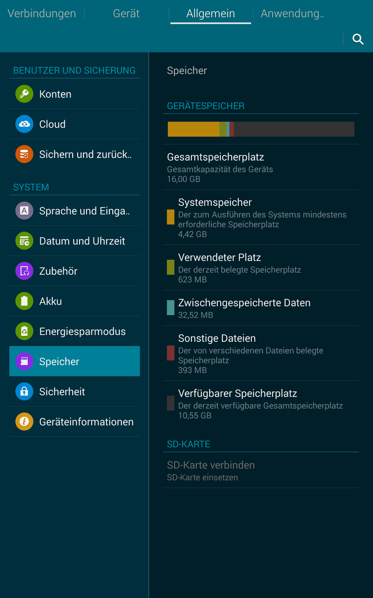 Der Speicher des Samsung Galaxy Tab S 10.5 ist in 16 und 32 GB erhältlich. Bei unserem Testgerät handelt es sich um eine 16-GB-Variante. Nach dem ersten Start stehen dem Nutzer davon 10,6 GB zur freien Verfügung. Da Samsung einiges an Apps vorinstalliert, kann weiterer Platz freigegeben werden, indem unnötige Anwendungen deinstalliert werden. Leider ist dies nicht mit allen Apps möglich. Wer mehr Speicher benötigt, kann diesen mittels MicroSD-Karte um bis zu 128 GB erweitern. Da das System auch App2SD unterstützt, können auch Apps auf den Zusatzspeicher ausgelagert werden.
