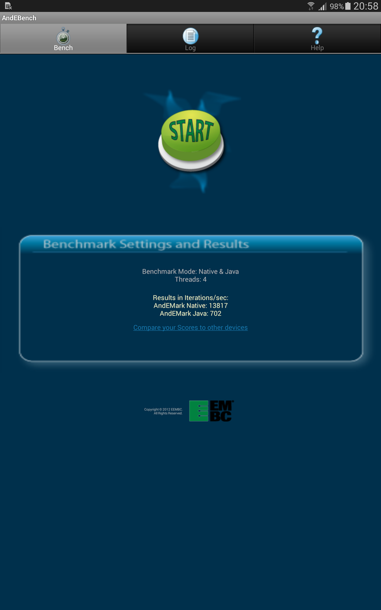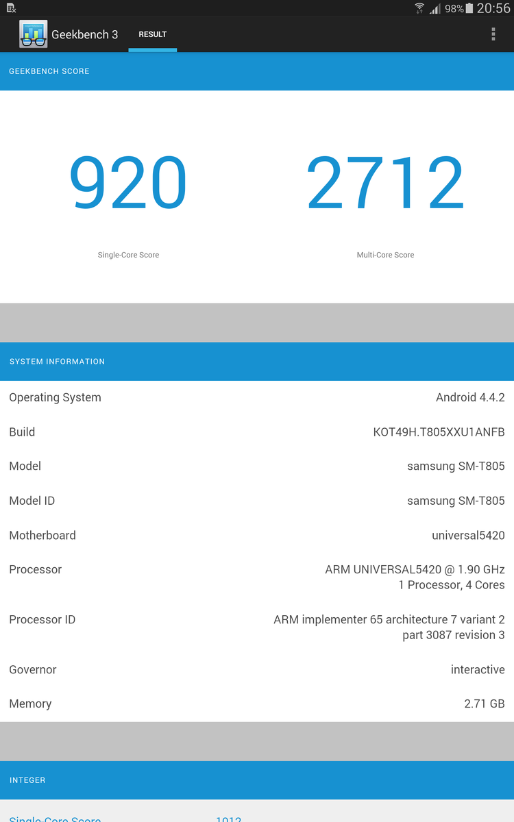 Die Leistung kann sich sehen lassen, gehört aber nicht mehr zu den aktuellen Highend-Produkten. Die Anwendungsleistung ist dennoch sehr gut und liegt in etwa auf dem Niveau eines Snapdragon 800. Je nachdem wie die vielen Prozessorkerne von den Apps genutzt werden können, ist das Tab S 10.5 auch mal schneller als die Konkurrenten. Auch die Grafikleistung ist gut, kann jedoch mit aktuellen Top-Systemen nicht mithalten. Das zeigt sich besonders deutlich im 3DMark Ice Storm Unlimited Graphics Score (13.791 Punkte), in dem alle Konkurrenten schneller sind. Im GFXBench 2.7 (offscreen, 23 fps) ist es schon etwas ausgewogener. Bei den Onscreen-Tests muss das Tablet jedoch seiner hohen Auflösung Tribut zollen und erzielt hier entsprechend niedrigere Frameraten.