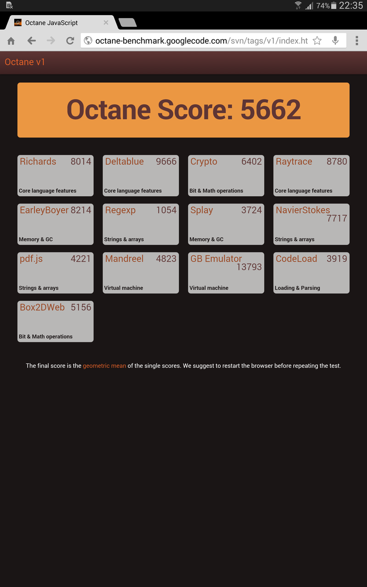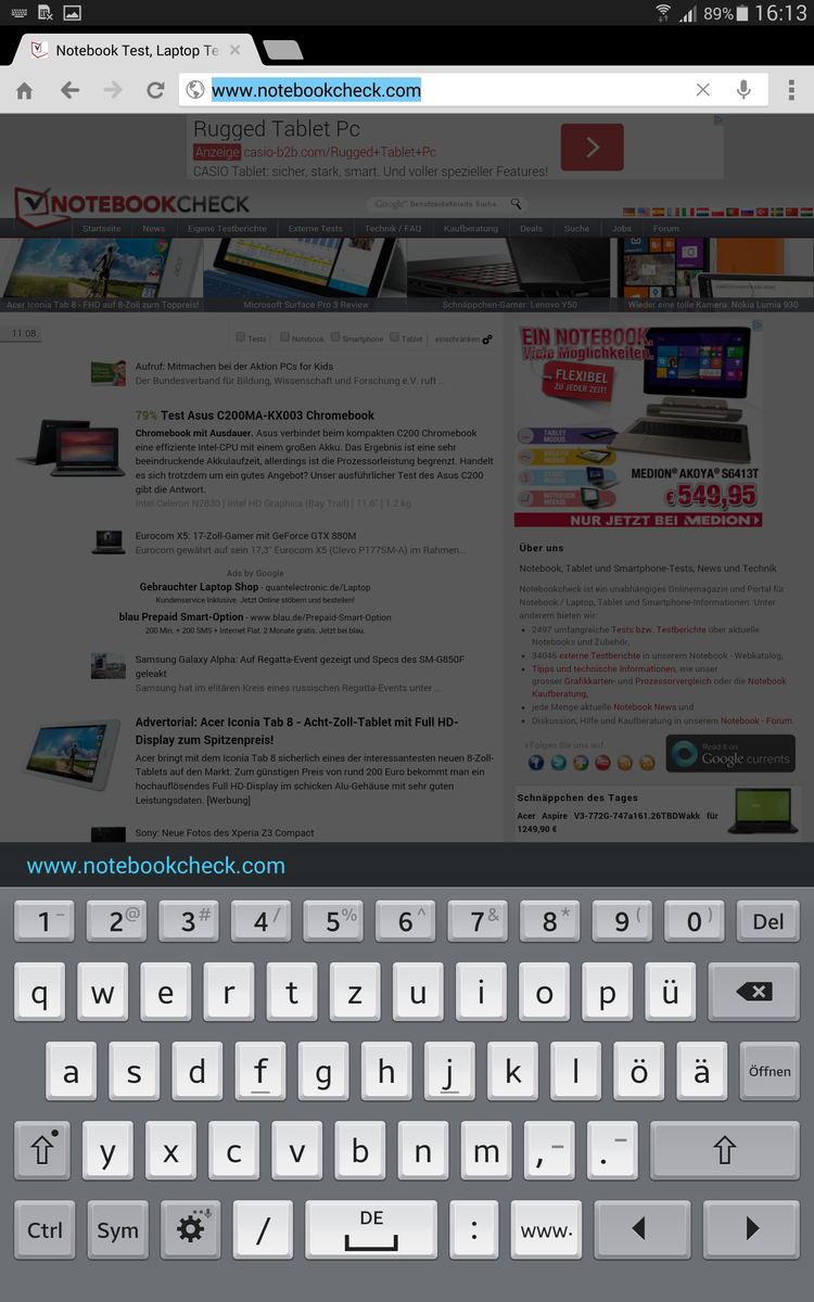 In puncto Browser-Performance muss sich das Samsung Galaxy Tab S 10.5 nicht verstecken. Im Zusammenspiel mit dem vorinstallierten Google Chrome Browser (Version 36) liefert das Tablet auch in den Benchmarks gute Ergebnisse. Lediglich im Sunspider 1.0 läuft es der Konkurrenz ein wenig hinterher. In der Praxis geht das Surfen im Web jedoch flott von der Hand. Auch im MultiWindow Modus sind keine Geschwindigkeitseinbußen spürbar.