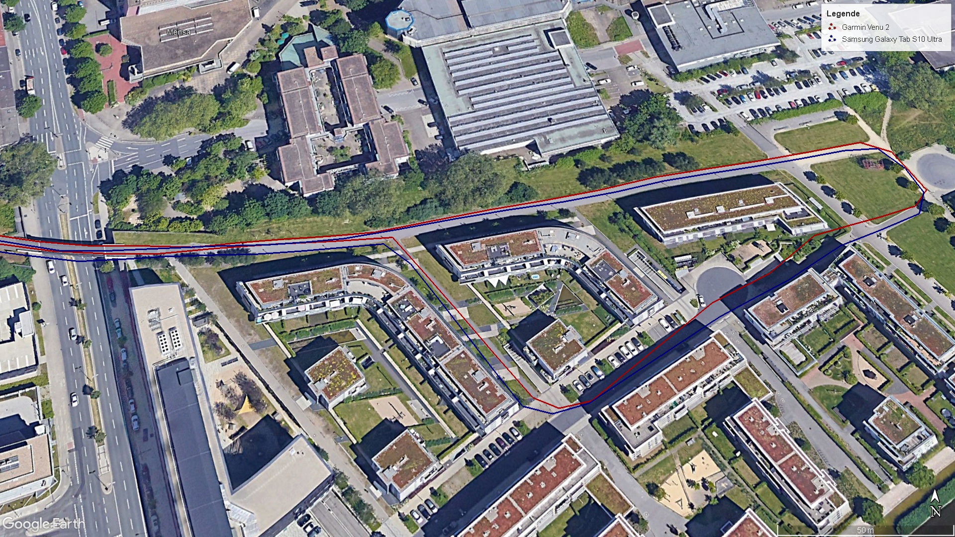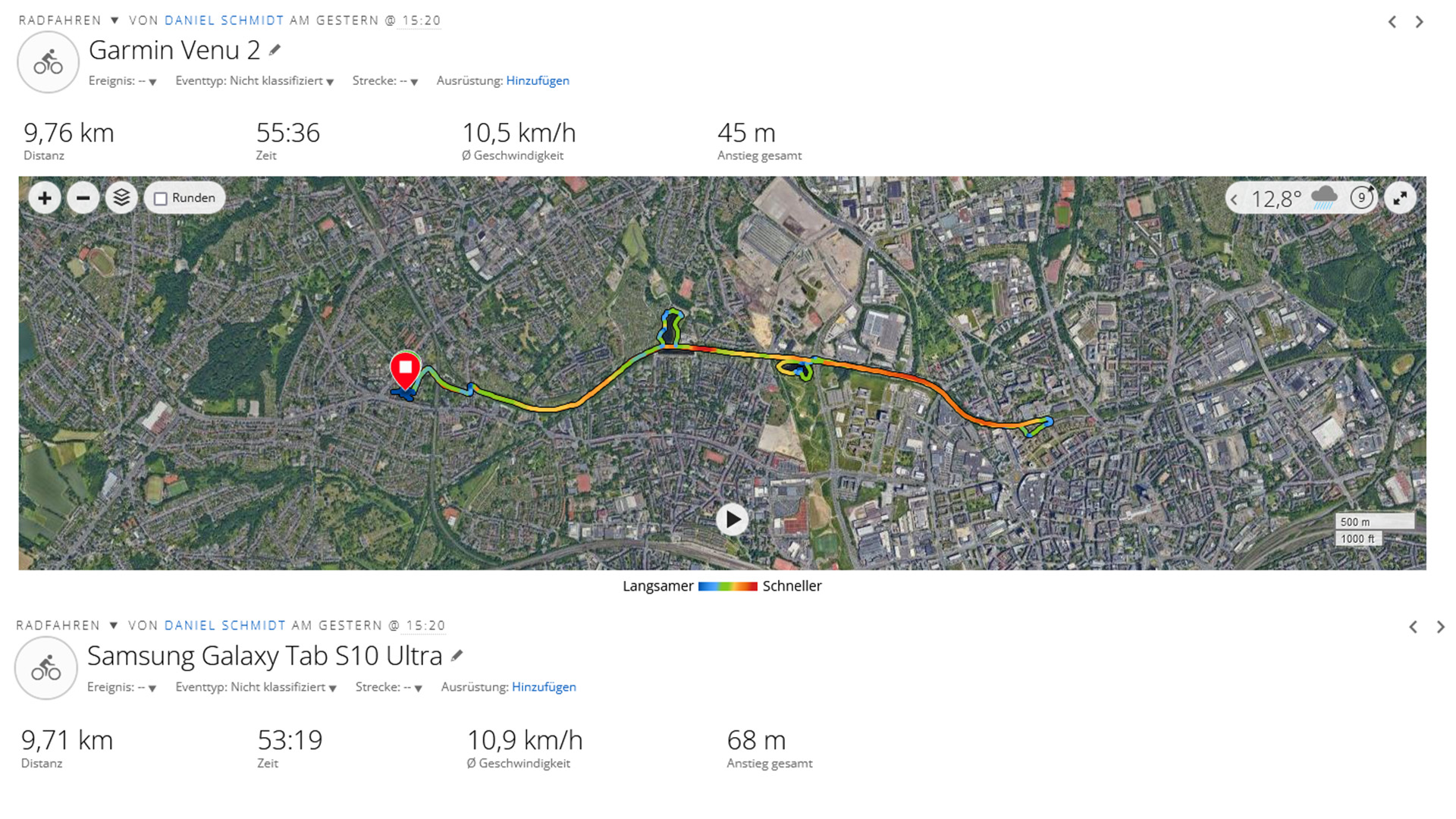Auf einer Radtour vergleichen wir das große Tablet mit der Garmin Venu 2. Das Tab S10 Ultra zeichnet die Strecke zwar nicht tadellos nach, jedoch sind bei Navigationsaufgaben keinerlei Einschränkungen zu erwarten.