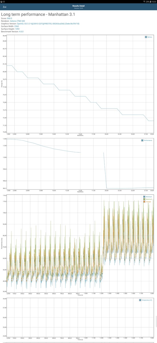 Auch im Inneren haben die Koreaner die Wärmeentwicklung recht ordentlich im Griff. Im anspruchsvollen Manhattan-Szenario des GFXBench-Akkutests bleibt das Samsung-Tablet lange Zeit recht stabil, bevor es dann doch rund ein Drittel seiner Ursprungsleistung einbüßt.