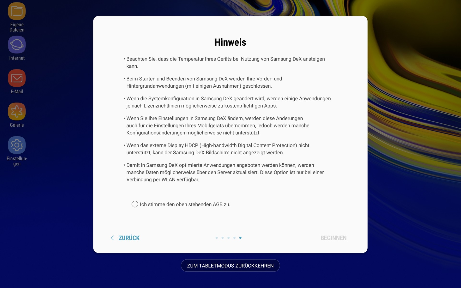 In das Galaxy Tab S4 hält nun auch endlich Samsung DeX Einzug, was bisher nur als zusätzliches Feature für die Galaxy-S-Smartphones angeboten wurde und entweder ein DeX Pad oder eine Dockingstation voraussetzte. Bei seinem Tablet geht Samsung einen anderen Weg und ermöglich die Nutzung unkompliziert per Umschaltung, sodass mit einer optionalen Tastatur echtes Laptop-Feeling aufkommt. Vor allem in puncto Multitasking ist DeX ein echter Mehrwert. Leider kann die Benutzerkontensteuerung nicht im DeX-Modus genutzt werden und auch der S Pen ist nur eingeschränkt nutzbar. Eingaben und Notizen sind zwar möglich, doch das schnelle Aufrufen des Shortcut-Menüs über die Stifttaste funktioniert nicht.