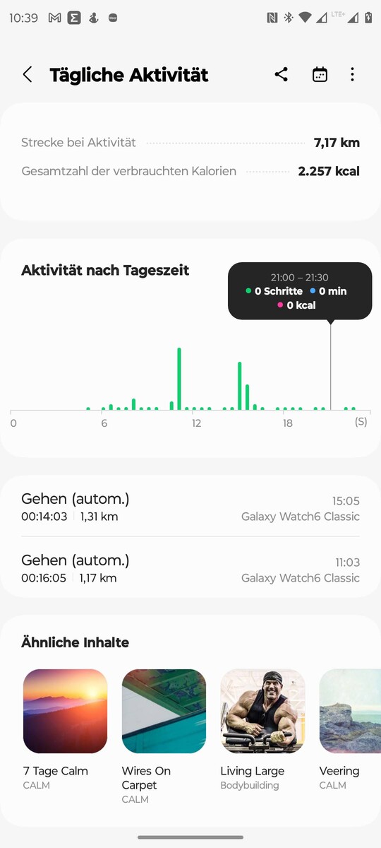 Die Galaxy Watch6 Classic kann Gehen, Laufen und Radfahren automatisch erkennen und tracken. Das funktioniert im Test sehr gut und zuverlässig. Allerdings ist der Umfang der erhobenen Daten geringer als bei manuell gestarteten Trainings.