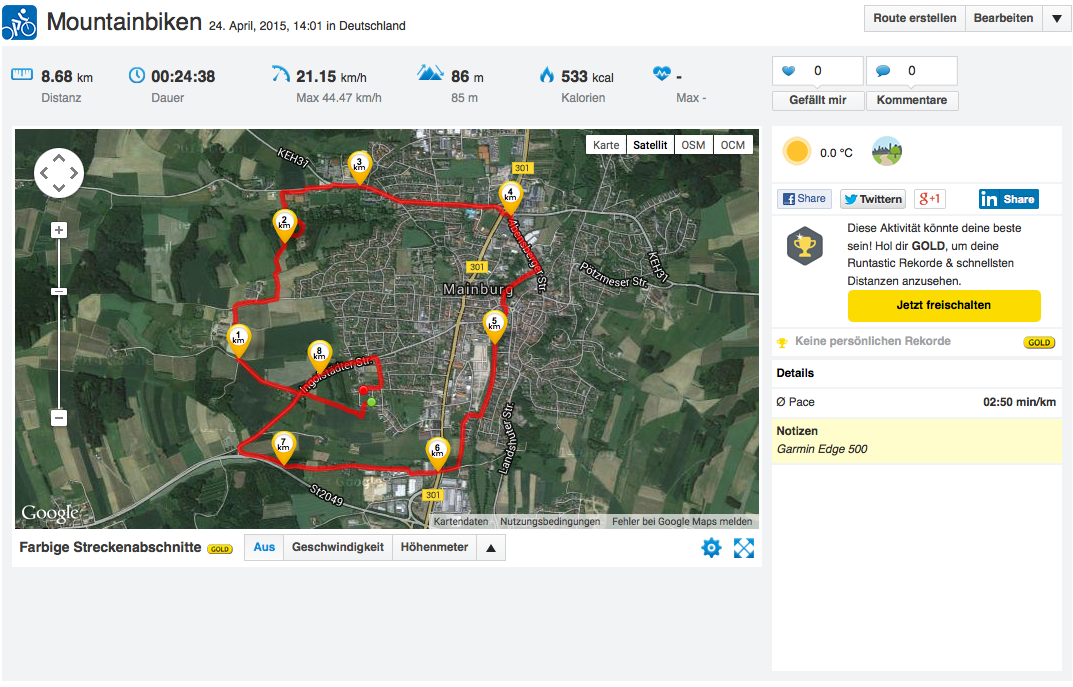 Weil wir es genauer wissen wollen, unterziehen wir das Galaxy Xcover 3 auch einem Praxistest: Bei einer Ausfahrt mit dem Mountainbike muss es sich gegen das Profi-Navi Garmin Edge 500 behaupten. Das gelingt ihm nicht so wirklich gut: Die gemessene Wegstrecke ist um 300 Meter kürzer als beim Profi-Gerät, Abweichungen vom Weg sind auch bei der Waldstrecke schon erkennbar. Bei der Brückenüberfahrt lässt uns das Galaxy Xcover 3 über den Bach und ein Garagendach schweben, anstatt uns korrekt auf der Brücke und der Straße zu platzieren.