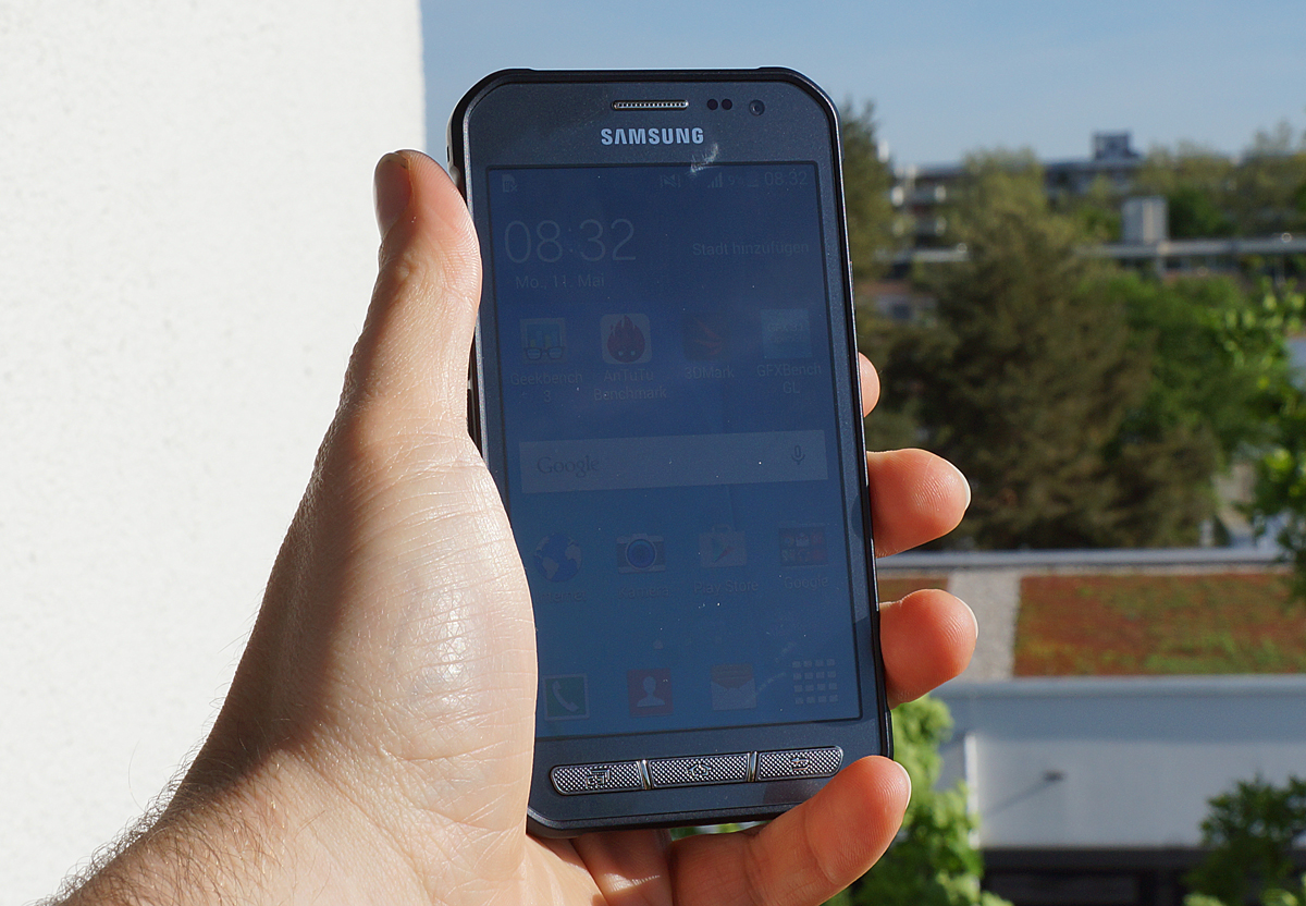 Der Bildschirm spiegelt stark, das fällt bei einem Smartphone, das eigentlich für den Außeneinsazu prädestiniert ist, natürlich besonders negativ auf. Die Helligkeit ist zwar hoch, aber doch deutlich niedriger als beispielsweise beim Kyocera Torque und so fällt es im hellen Sonnenlicht schon schwer, auf dem Bildschirm des Galaxy Xcover 3 noch etwas zu erkennen. In dunkleren Umgebungen und Innenräumen hat man weniger Probleme, auch hier stört aber ab und an der stark spiegelnde Bildschirm.