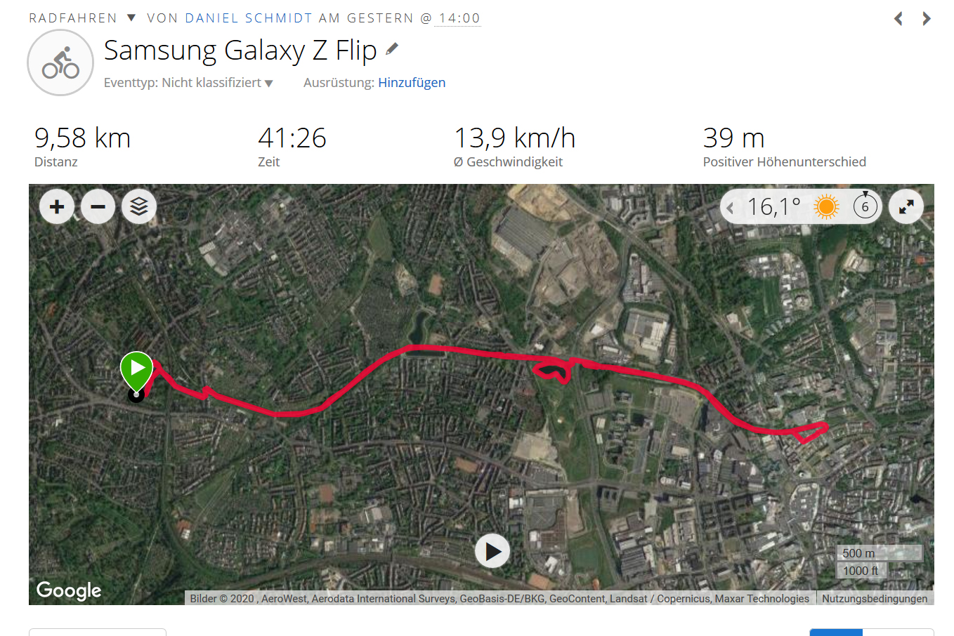 Auf einer kleinen Radtour muss sich das faltbare Smartphone dem Vergleich mit dem Fahrradcomputer Garmin Edge 500 stellen. Bei einer Gesamtstrecke von über neun Kilometern beträgt die Differenz zwischen den beiden Geräten immerhin 110 Meter. Tatsächlich fällt diese jedoch zugunsten des Flips aus, welches den Weg noch ein wenig genauer protokolliert.