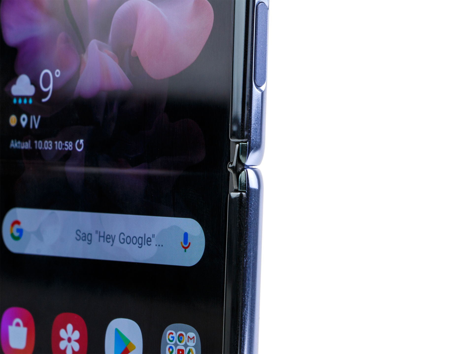 Eine wichtige Rolle nimmt das neue Zwei-Achsen-Scharnier des faltbaren Galaxy-Smartphones ein. Dieses soll sich 200.000 Mal ohne Qualitätsverlust nutzen lassen. Außerdem schützen die FreeStop-Fasern innerhalb der Mechanik das Innenleben des Smartphones vor Staub. Wie die Kollegen von iFixit zeigen, hilft dies zwar nur bedingt vor Unmengen von Staub, jedoch sei an dieser Stelle auch gesagt, dass das Flip weder eine IP-Zertifizierung gegen das Eindringen von Staub noch von Wasser besitzt. Im Alltag hatten wir damit eigentlich keine Probleme, wer das Galaxy Phone in der Hosentasche umherträgt, muss jedoch öfter die Knickfalz des Panels von Staub und Fusseln befreien, welche sich dort aufgrund der nicht bündig schließenden Komponenten sammelt.