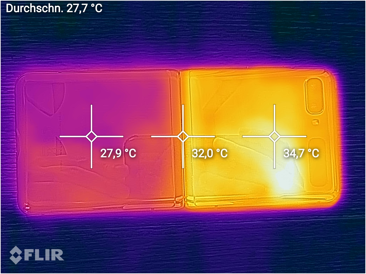 Die Oberflächentemperaturen des Galaxy Z Flip bleiben im Leerlauf sehr niedrig und unter Last wird das Smartphone stellenweise höchstens 38,8 °C warm, was absolut unbedenklich ist.