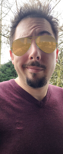 Die Frontkamera des Samsung Galaxy Z Flip erinnert an die des Galaxy S10 und offeriert 10 MP mit Autofokus und zahlreichen anderen Features. Die Qualität der Frontkamera ist recht gut, bei schwachem Umgebungslicht schwindet diese aber zusehends. Wer gerne AR-Sticker benutzt, wird eine interessante Überraschung erleben, denn diese beinhalten nun Werbung. Das Foto lässt sich normal aufnehmen, wird jedoch ein modisches Accessoire ausgewählt, zeigt das Smartphone nach der Aufnahme das passende Originalprodukt an, samt Preis und Link zum Shop - sehr geschäftstüchtig.