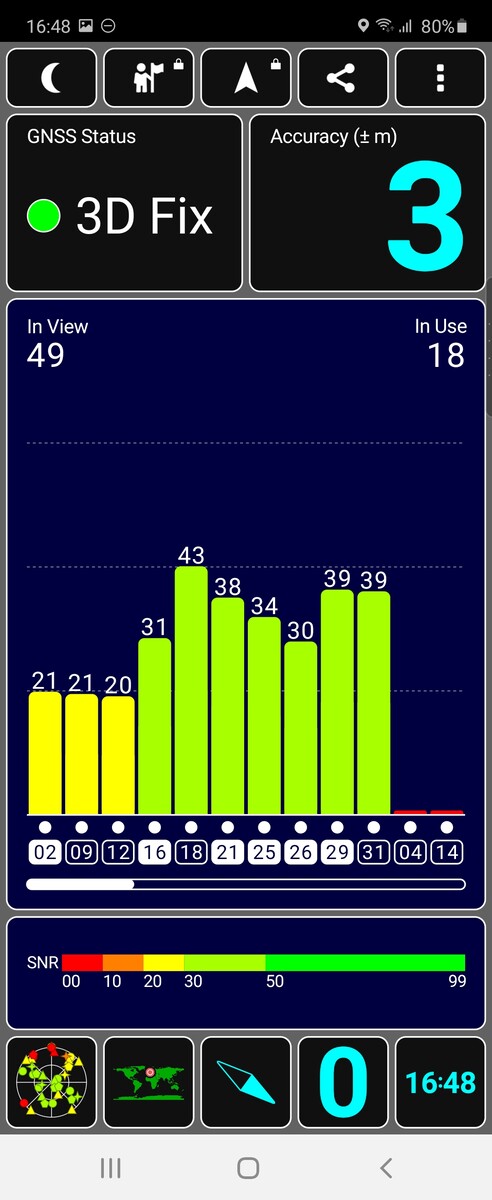 Der Satfix mit dem Galaxy Z Flip will innerhalb von Gebäuden nicht gelingen, obwohl die Signalstärke eigentlich hoch genug ist. Im Freien gelingt dies dann aber recht flott und pendelt sich schnell auf eine Genauigkeit zwischen drei und vier Metern ein.