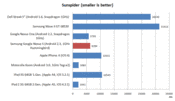 Eine Möglichkeit die Performance des installierten Browers (der mittlerweile auch uneingeschränkt Flash beherrscht) objektiv zu vergleichen bieten einige Browser-Benchmarks. Im Google V8 Benchmarktest erreicht das Nexus S 237 Punkte und kann damit das iPhone 4 und auch das Samsung Wave II (selbe CPU, Bada OS) deutlich überholen. In diesem Benchmark fällt wenig überraschend allgemein das gute Abschneiden von Android-basierenden Devices auf.