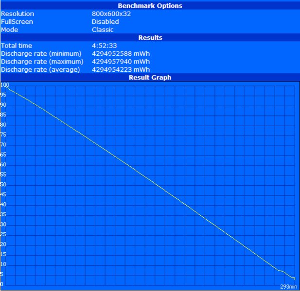 In Laufzeiten ausgedrückt bedeutet das konkret 657 Minuten maximale Netzunabhängigkeit im Battery Eater Readers Test (maximale Laufzeit, W-LAN/ BT usw. aus, geringste Displayhelligkeit), 293 Minuten minimale Laufzeit im fordernden Battery Eater Classic Test (minimal erreichbare Laufzeit, alle Komponenten an, Display mit voller Helligkeit, Vollast) und 428 Minuten Laufzeit im praxisnahen W-LAN Test mit Browsertätigkeit (flüssiges Arbeiten, bei angenehmer Displayhelligkeit, W-LAN an). Damit sollten praxisgerechte Laufzeiten von um die 7 Std. keine Seltenheit sein und so manchen Arbeitstag gut überbrücken können.
